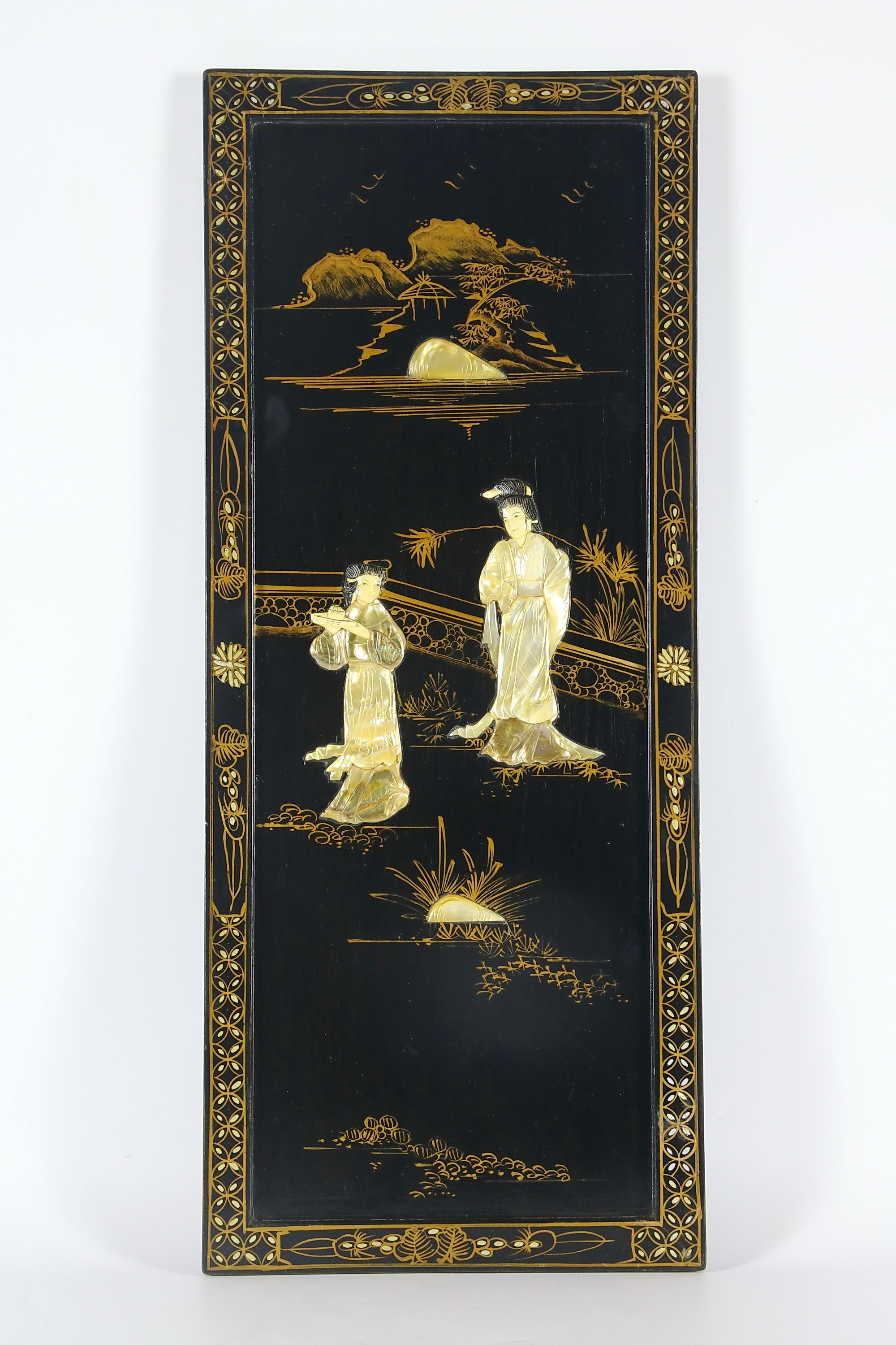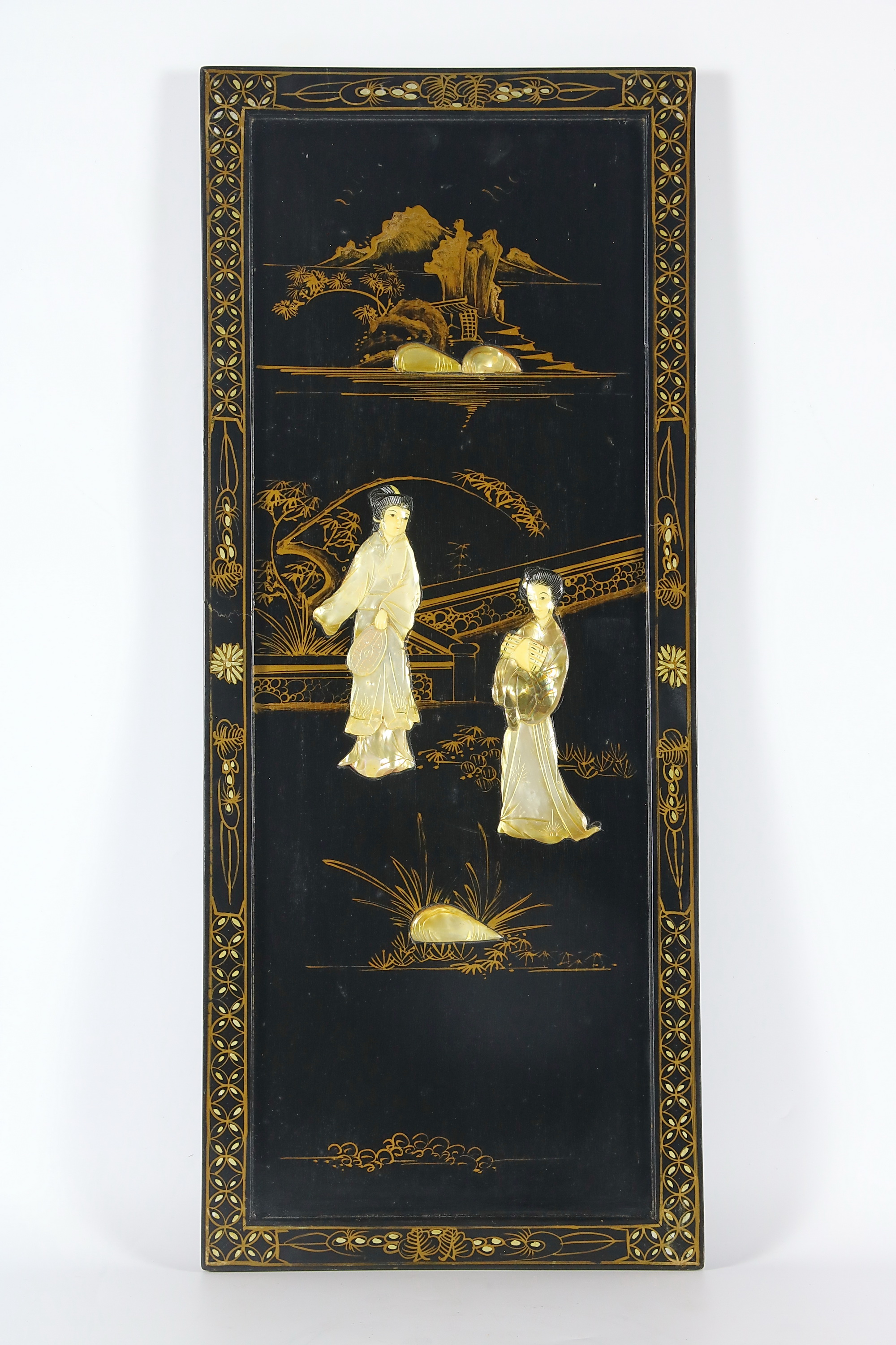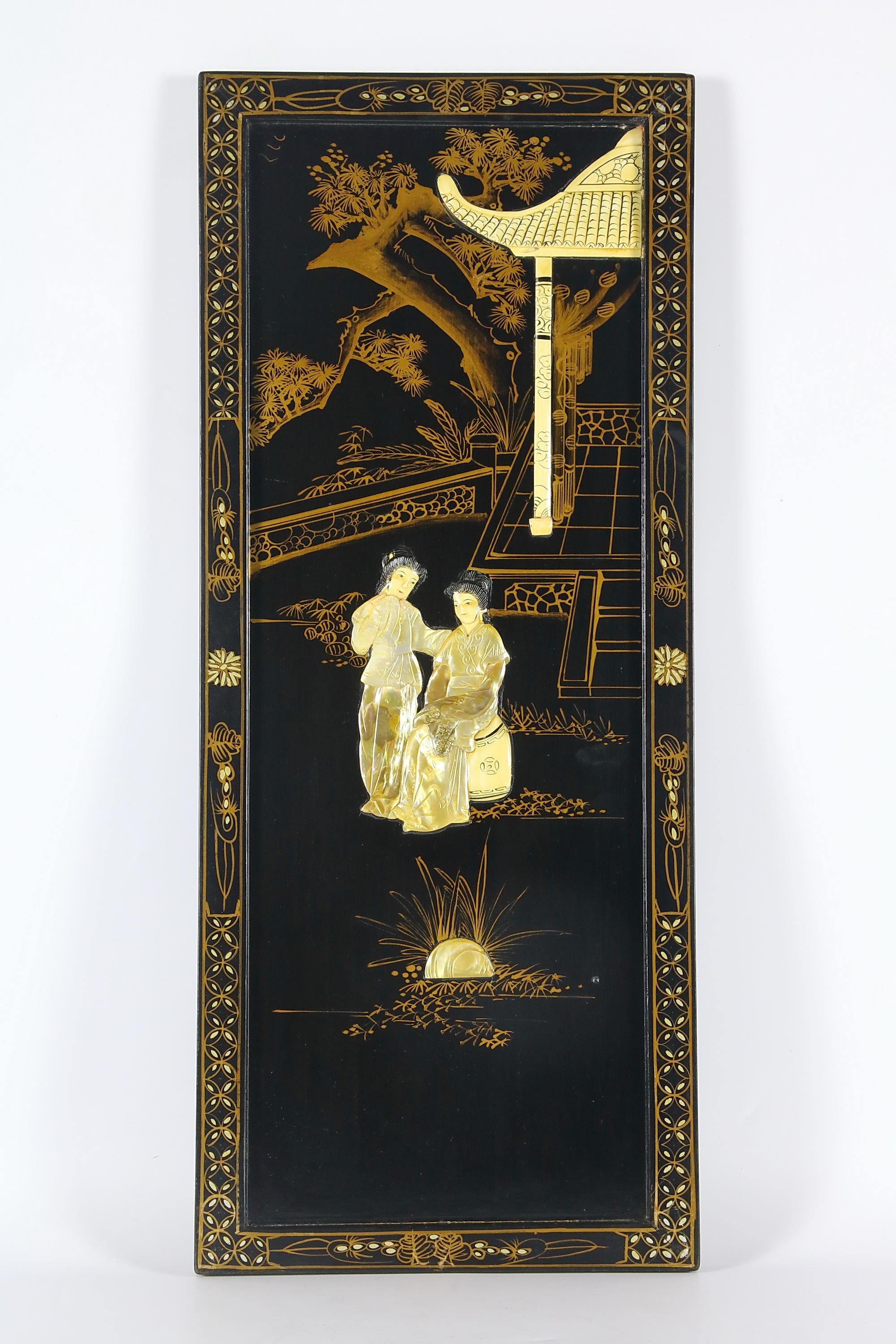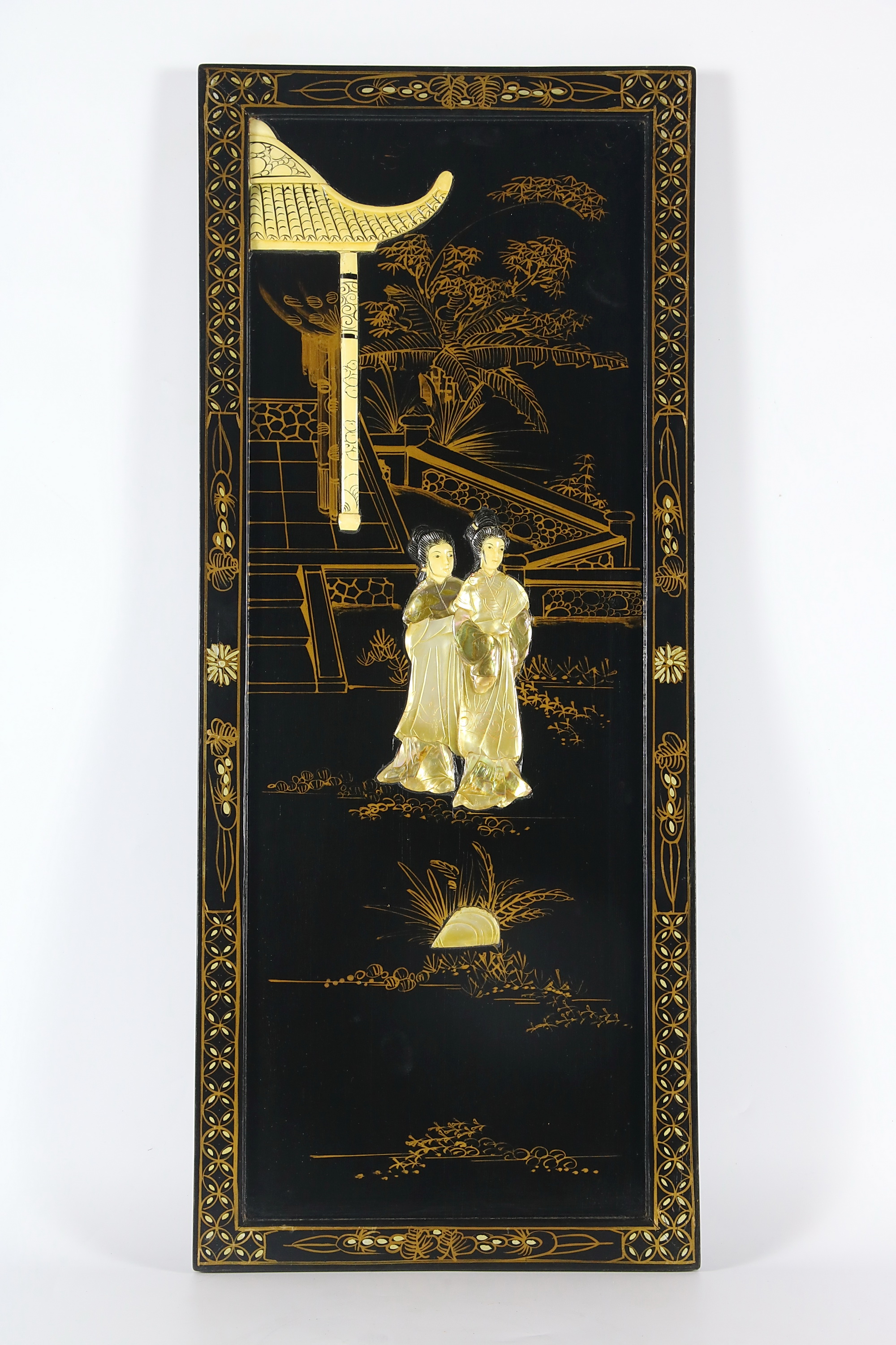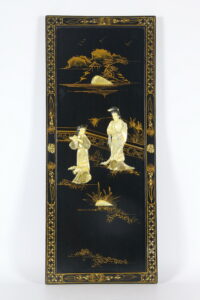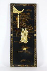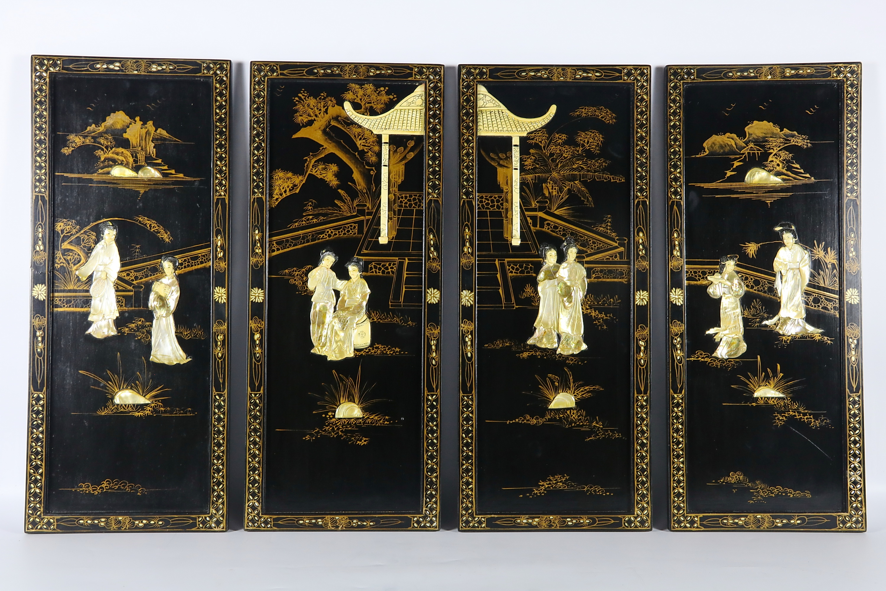 Комплект из 4-х старинных настенных панно со сценами из придворной жизни, изготовлен китайскими мастерами в первой половине ХХ века. Прямоугольные панели из дерева покрыты чёрным лаком — традиционным фоном, на котором особенно выразительно смотрится изысканная инкрустация слоновой костью и перламутром.