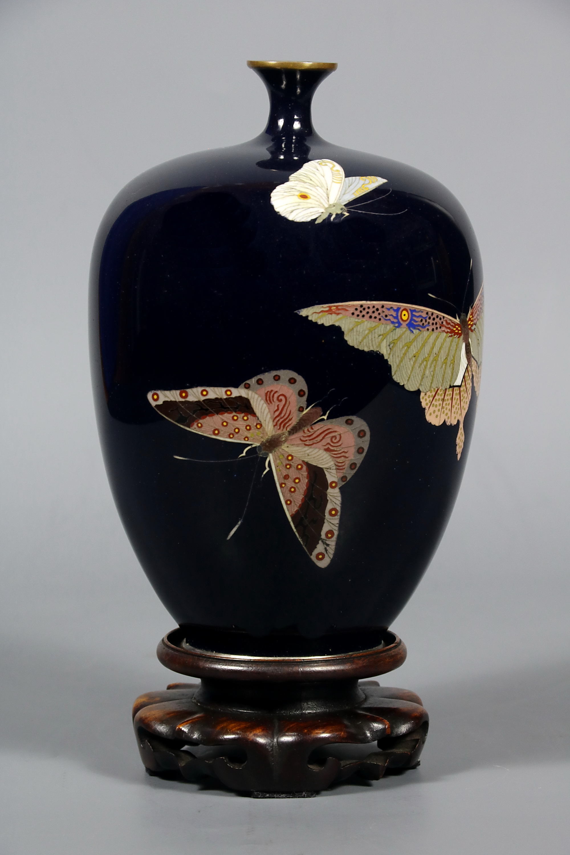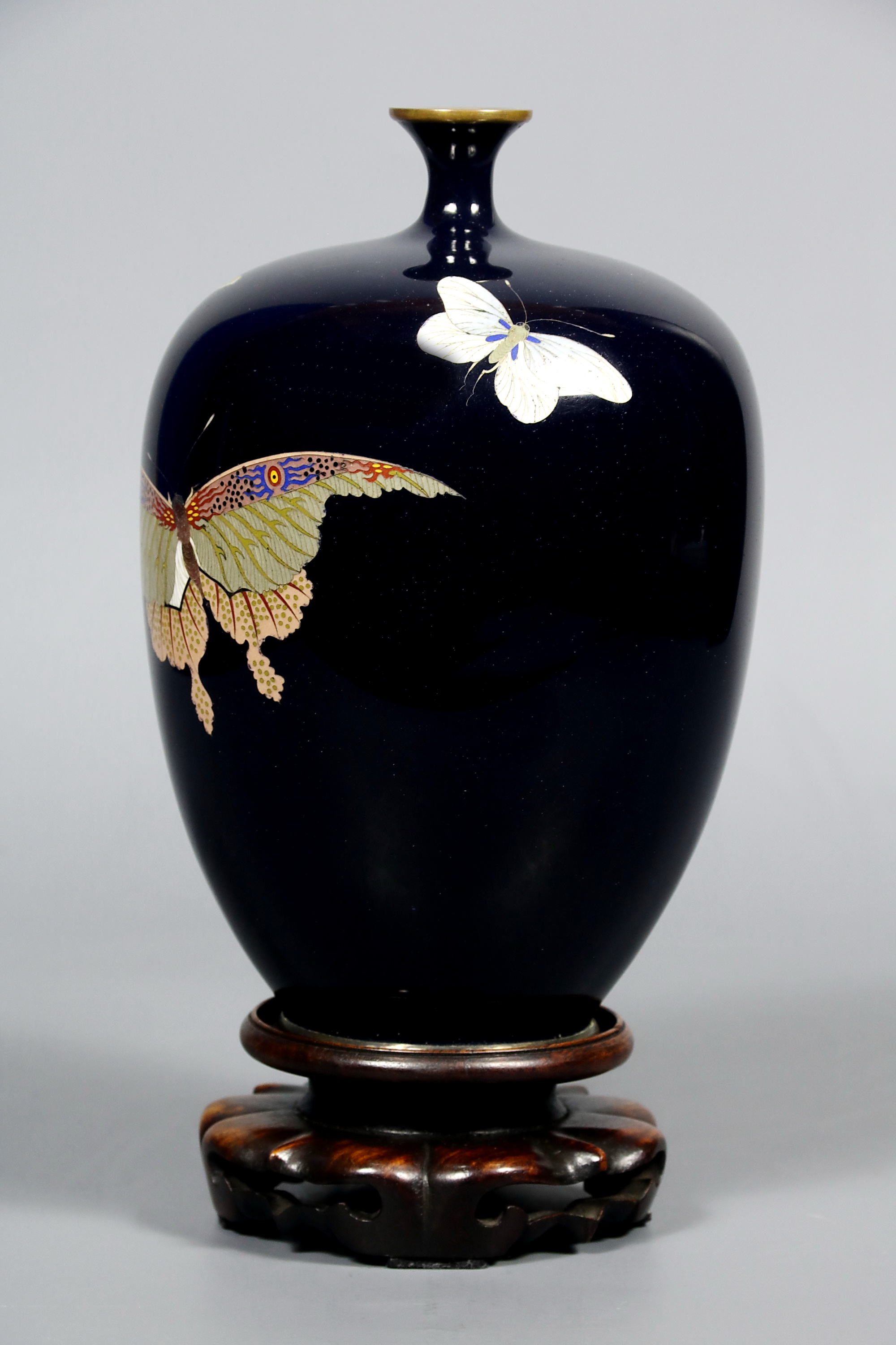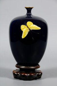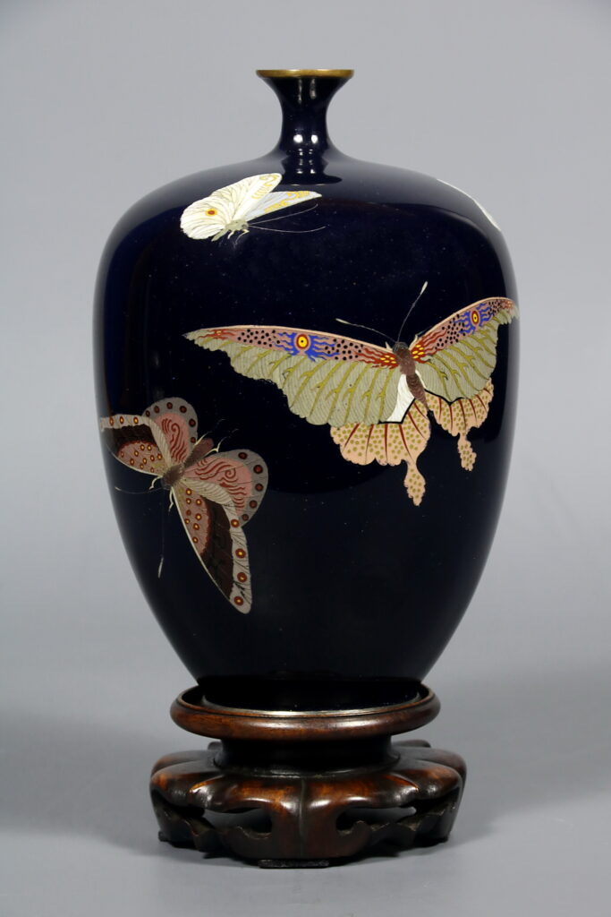 Японцы относились с особым вниманием и любовью к цветам, растениям и насекомым, которые являлись излюбленной темой у живописцев и мастеров декоративно-прикладного искусства. На тёмно – синей поверхности вазы, изображены разноцветные порхающие бабочки. Японское искусство глубоко символично. Бабочка — символ души, бессмертия, возрождения и воскресения, способности к превращениям, к трансформации, так как это крылатое небесное существо появляется на свет, преображаясь из мирской гусеницы.