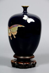 Это ваза с овоидной формой тулова и покатым оплечьем, плавно переходящим в сильно зауженное цилиндрическое горло, с раструбом. Изделие имеет латунную основу, полностью покрытую полихромными опаковыми эмалями методом юсэн, при котором из тонкой серебряной проволочки создавались перегородки, соответствующие контурам рисунка. После этого каждая ячейка заполнялась цветной эмалью.