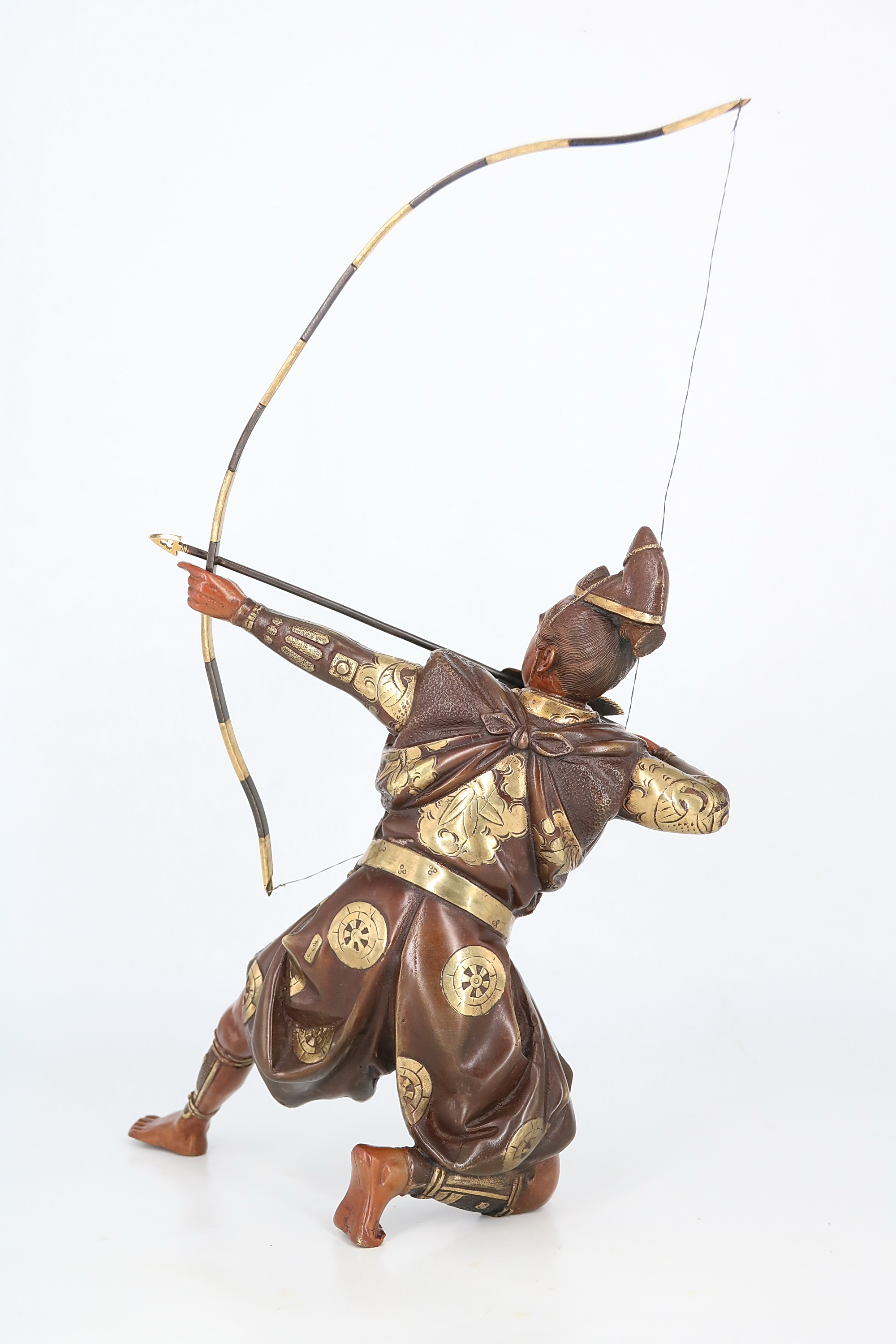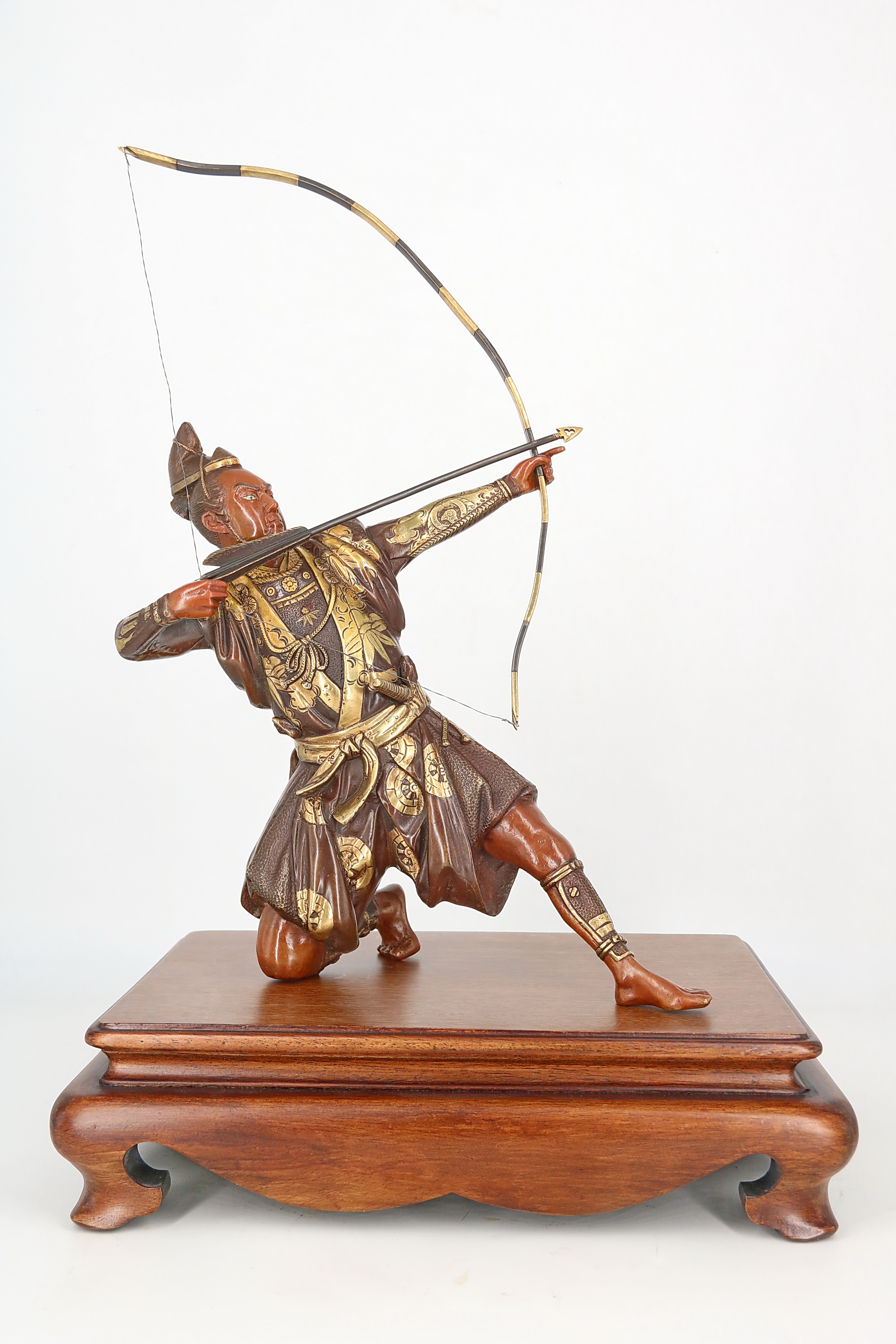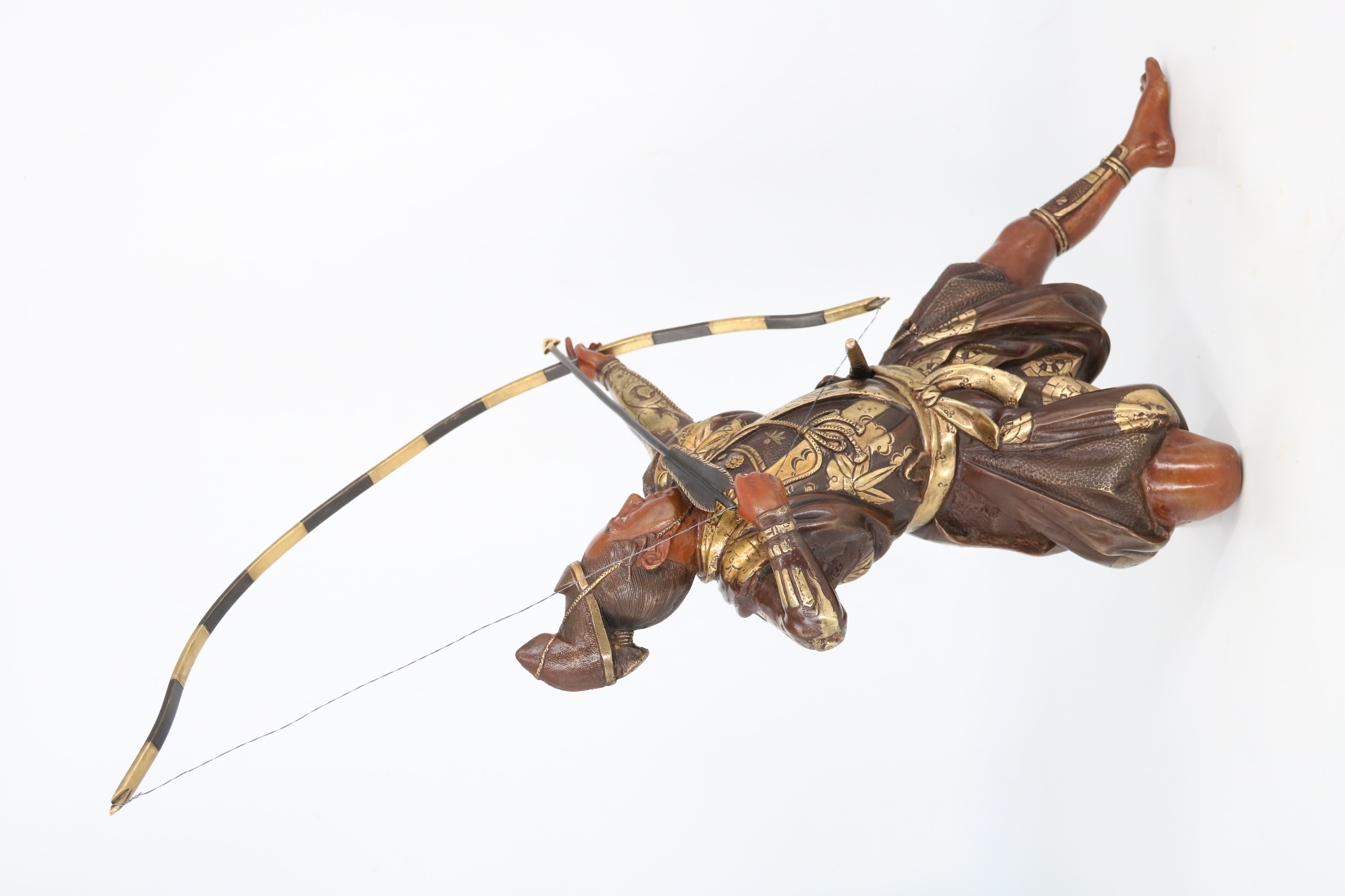 Мастер создал выразительный образ средневекового самурая – лучника, передав характерную позу, напряжение, сосредоточенность. Персонаж одет в костюм дворцовой стражи. Грудь скрывает панцирь до, руки и запястья до плеча обтянуты нарукавниками котэ, длинные и широкие штаны хакама подвернуты под завязанным спереди поясом. На голове шапка самурая-эбоси с выступающим над лбом треугольным навершием и высокой заломленной вперед тульей. Ноги спереди от щиколотки до колена защищены поножами сунэатэ. На левом боку, за поясом — короткий меч танто, который по традиции носили лезвием вверх. Лук и стрела изготовлены отдельно.