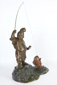 Настоящее изделие является характерным образцом японской скульптуры периода Мэйдзи (1868 – 1912гг.) созданной в технике художественного литья с последующей прочеканкой, гравировкой и патинированием поверхности, традиционным методом «рогата» («форма утраченного воска»), сложившихся при буддийских монастырях в период раннего средневековья.