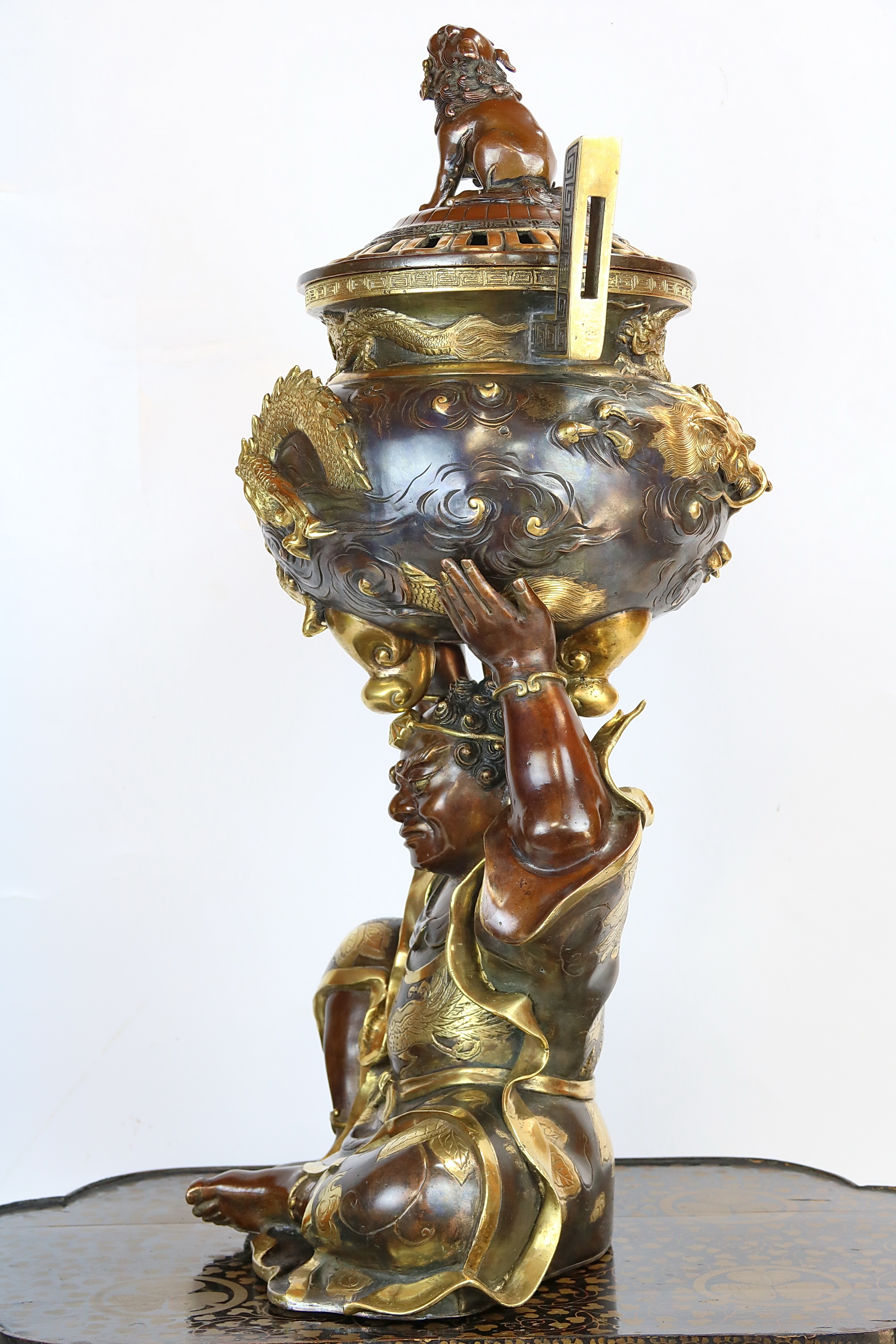 На тулове курильницы, в высоком рельефе извивающийся в волнах изображен дракон водной стихии. Другой дракон вписан в узкую полосу на горловине курильницы.