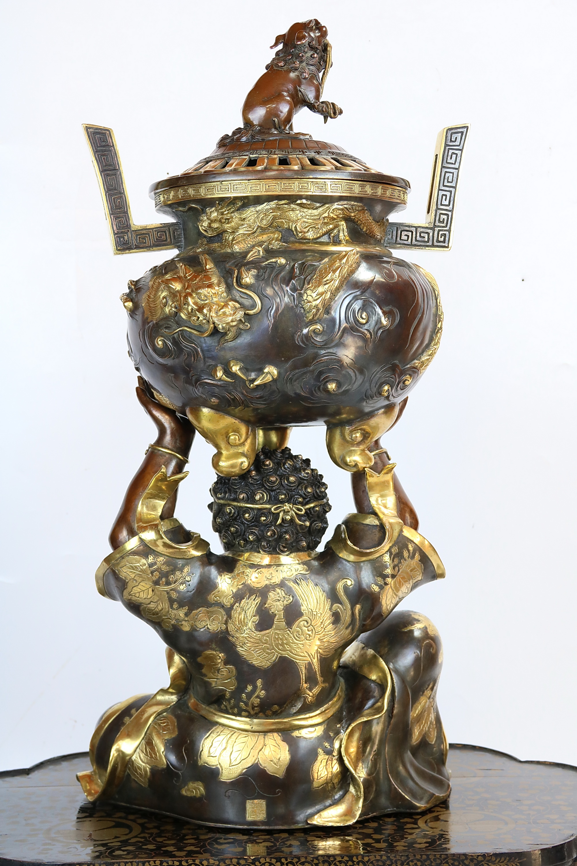 На тыльной стороне скульптуры имеется гравированная подпись, состоящая из двух иероглифов: «Ёси до». Она принадлежит одному из известных мастеров художественного литья периода Мэйдзи – Ёсидо, который родился в 1860 году в префектуре Гифу, работал в мастерских Кайёдо, в Осака, примерно с 1889 года.