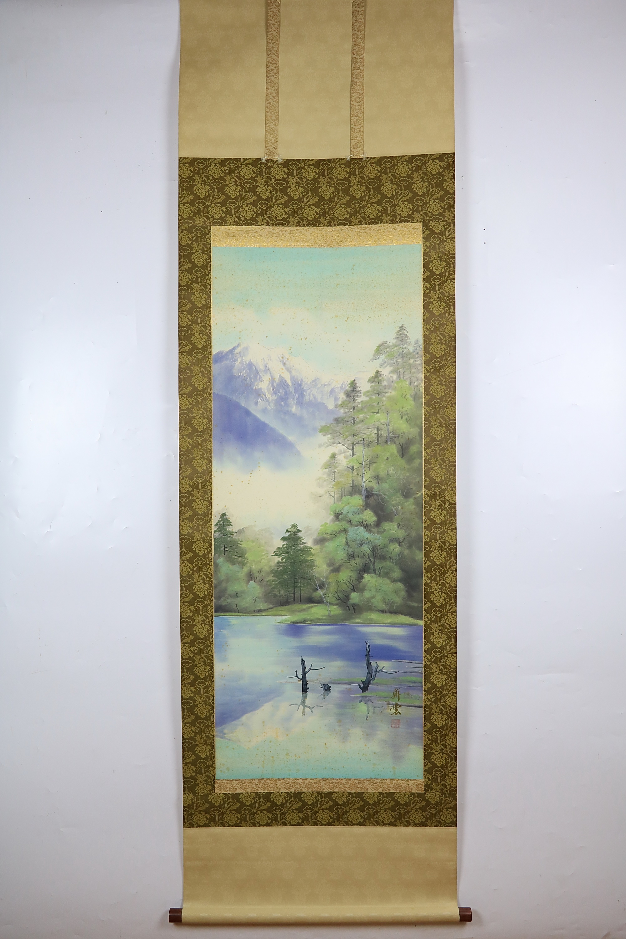 10. Свиток «Горный пейзаж» Шёлк, бумага, минеральные краски, живопись. Япония, середина — XX века. Подпись, печать. Размер: 186 х 54,5 см.
