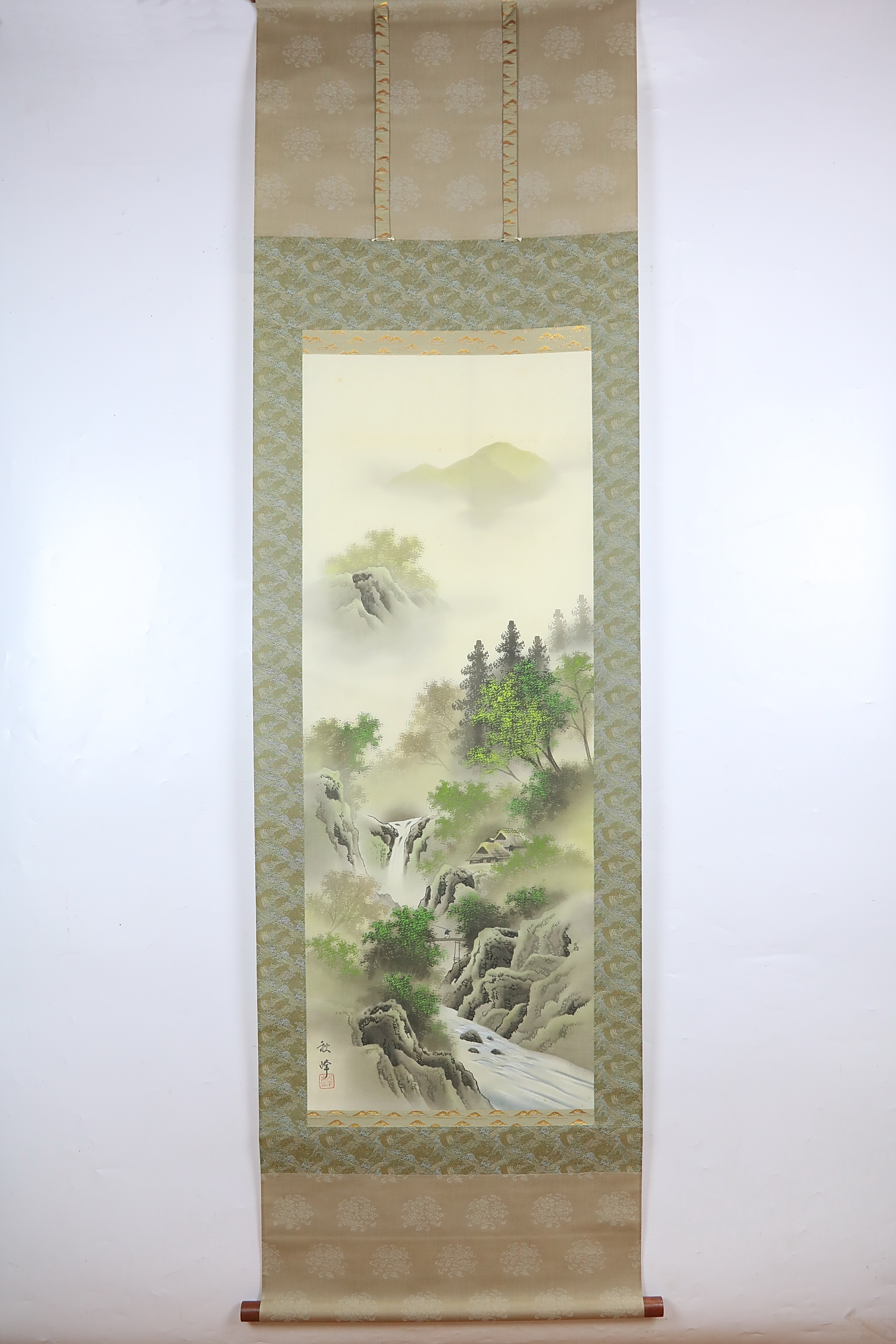 12. Свиток «Горный пейзаж» Шёлк, бумага, минеральные краски, живопись. Япония, середина — XX века. Подпись: Сики Коминэ. Размер: 190 х 54,5 см.