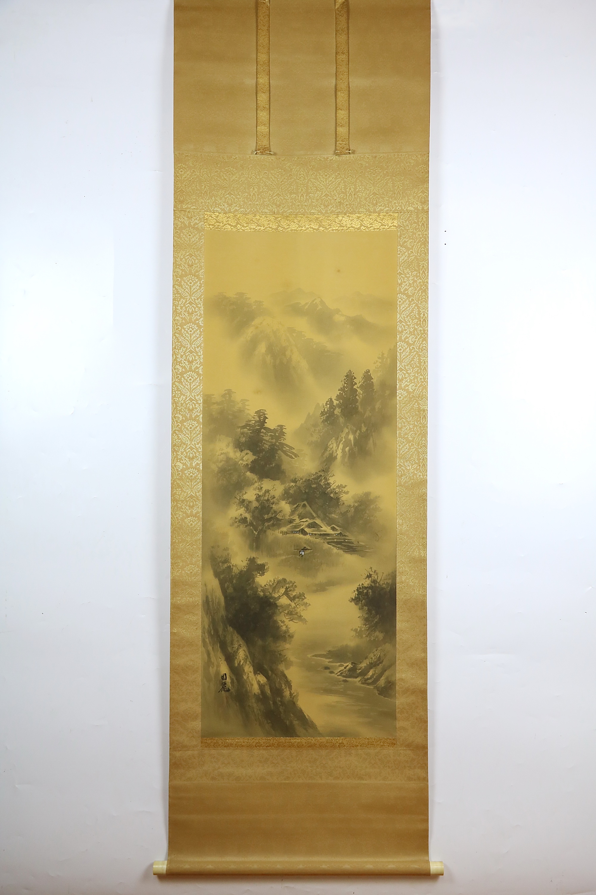 15. Свиток «Пейзаж с домиками и горами» Шелк, минеральные краски, живопись. Япония, конец XIX века. Подпись. Размер: 184 х 54,5 см.