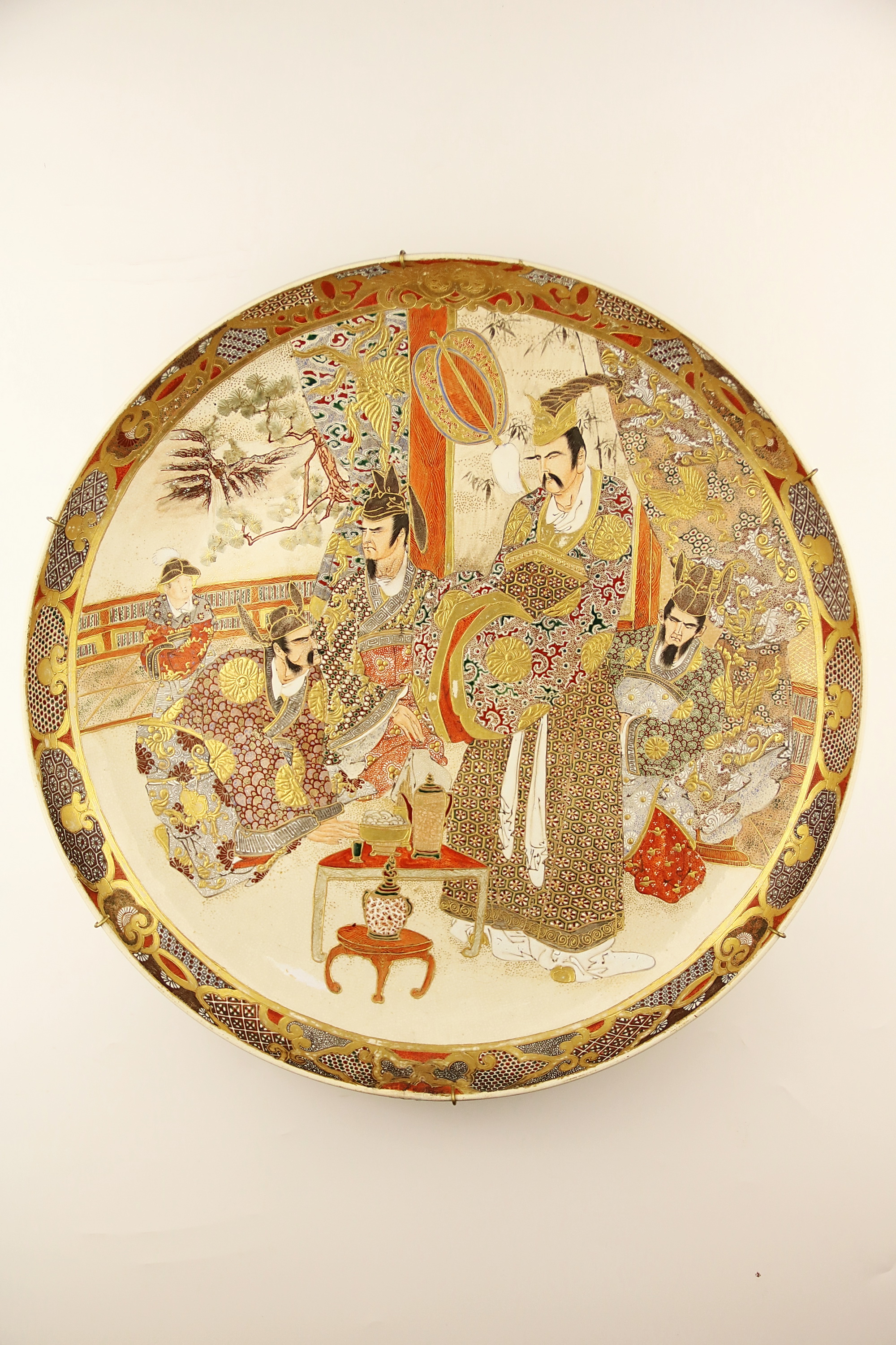 Т-7. Тарелка «Самураи во дворце» Фаянс, надглазурная роспись золотом, полихромными эмалями, железными красителями. Япония, период Мэйдзи (1868 – 1912) Сацумские мастерские. Диаметр — 45 см. Экспертное заключение.