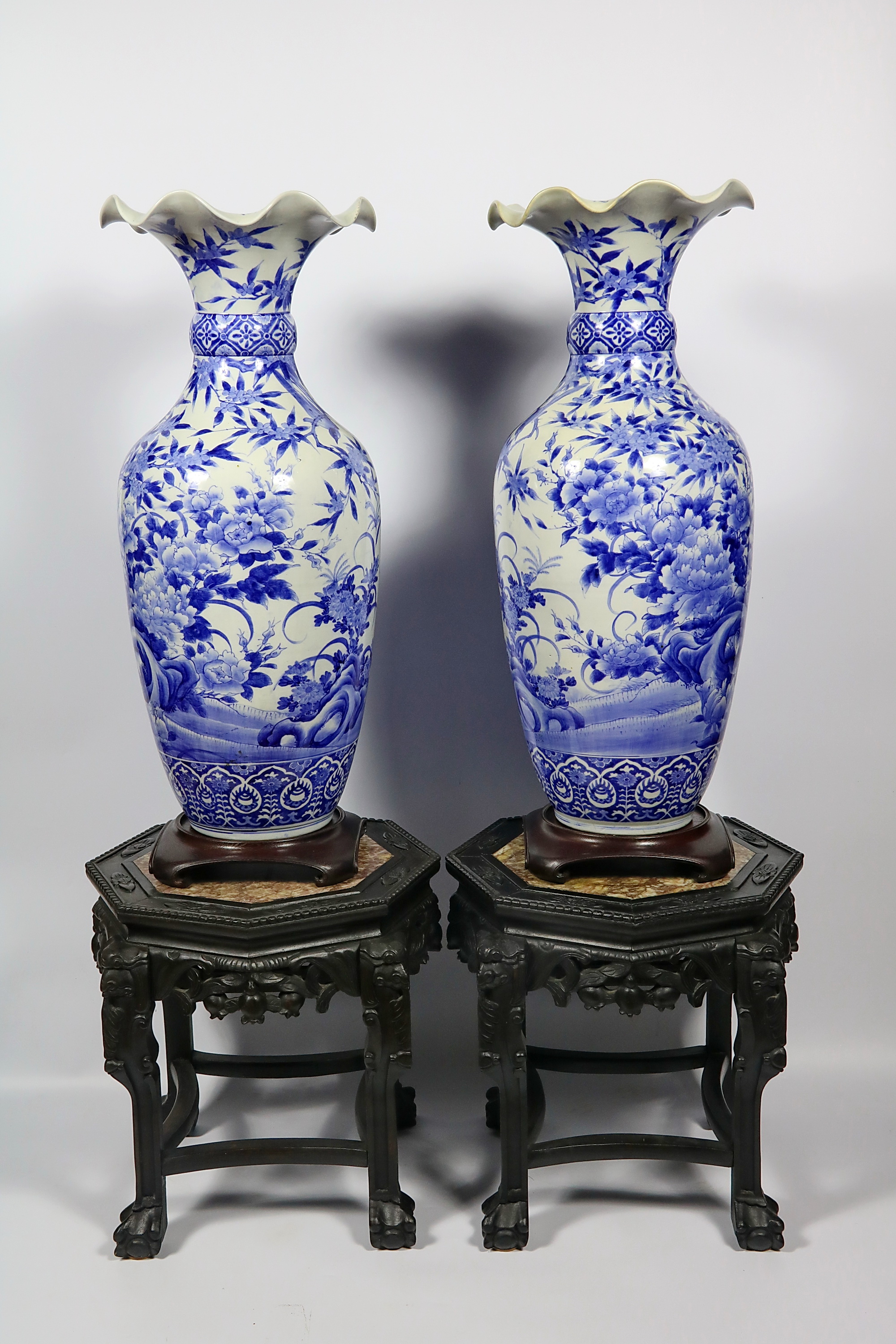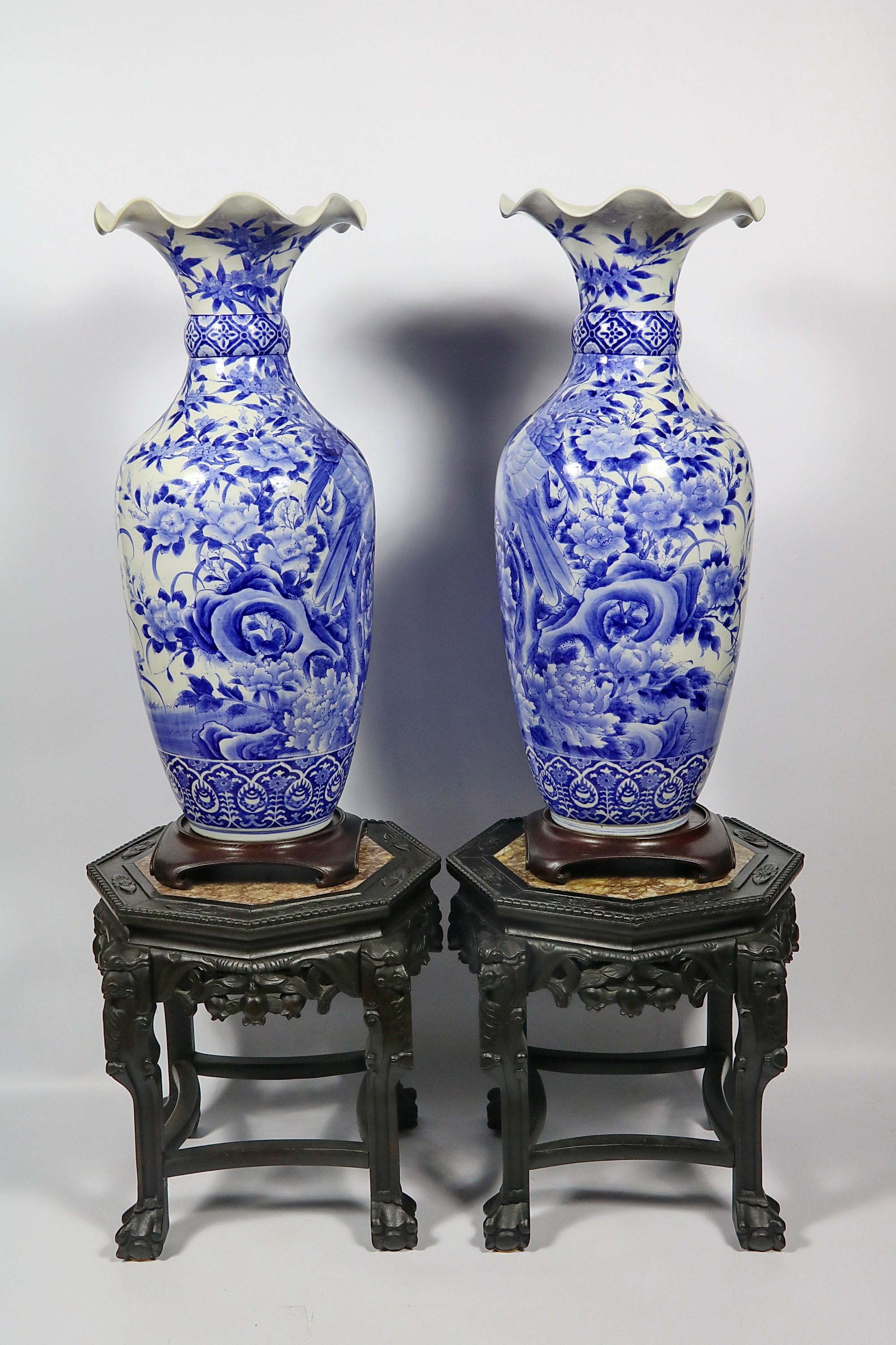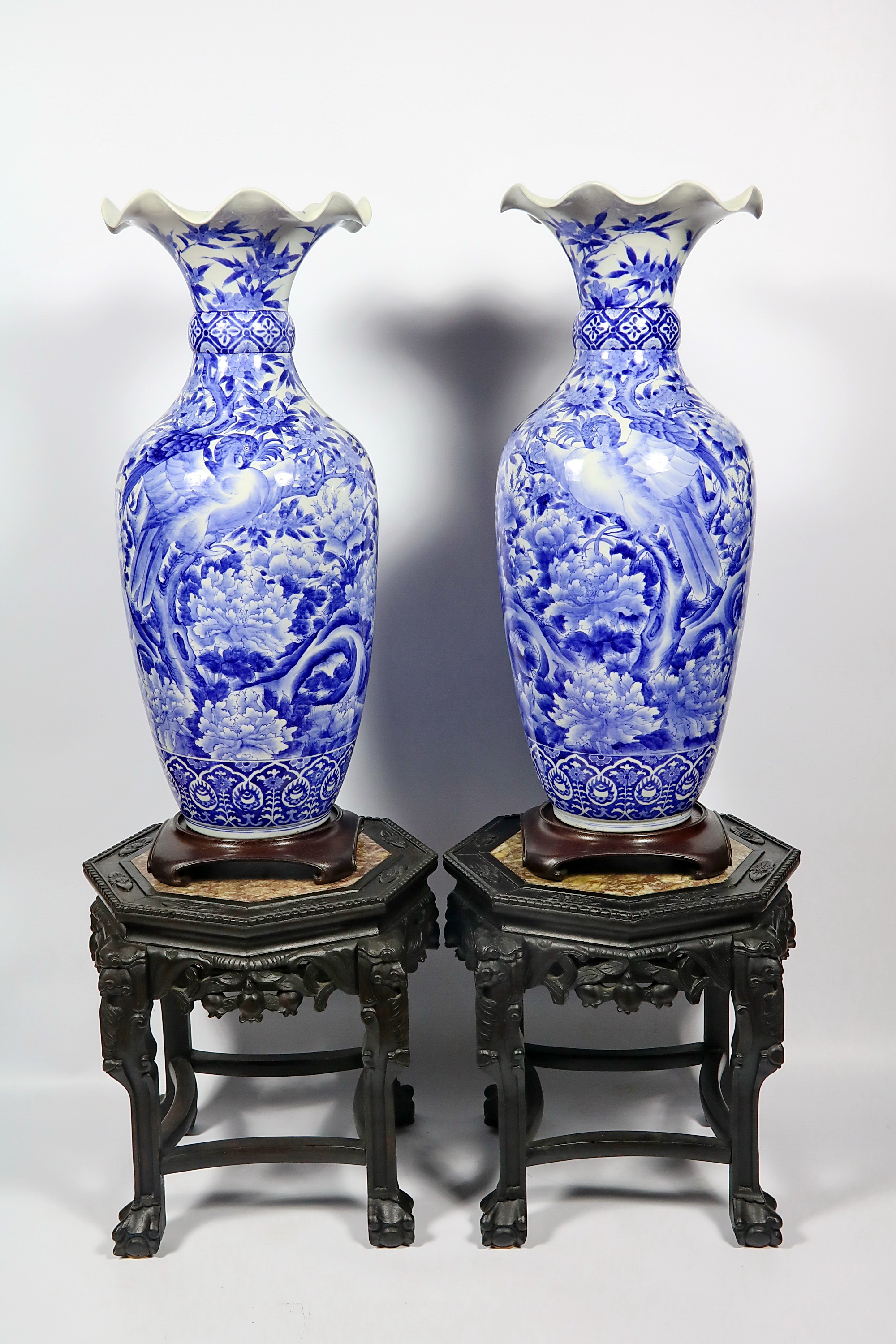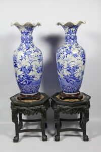Вазы выполнены в форме балясин с туловом овоидной формы и невысокими горловинами, переходящими в раструбы с волнистыми венчиками. Декорация, как и форма обоих ваз идентична. Композиционное решение парных изделий выполнено в виде круговых композиций, на которых изображены попугаи на ветках цветущих деревьев среди пионов. Раструбы заполнены синим декором в виде веток с цветами. Низ как и верх ваз, украшен растительным орнаментом.
