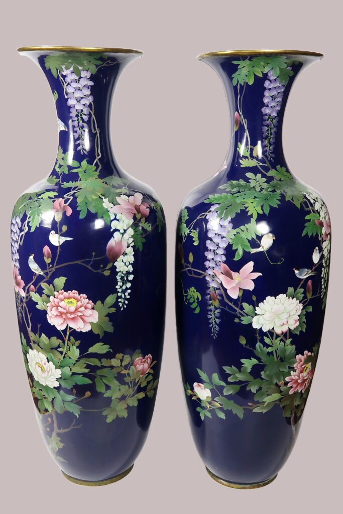 Это вазы с вытянутой балясиной формой тулова и покатым оплечьем, плавно переходящим в цилиндрическое горло, с расширяющимся раструбом. Изделия имеют латунную основу, полностью покрытую полихромными опаковыми эмалями методом юсэн, при котором из тонкой проволоки создавались перегородки, соответствующие контурам рисунка. После этого каждая ячейка заполнялась цветной пастообразной эмалью и запекалась в печи по степени тугоплавкости. В дальнейшем изделия шлифовали и тщательно полировали до блеска. Эта работа являлась довольно сложной и трудоемкой, занимала большое количество времени.
