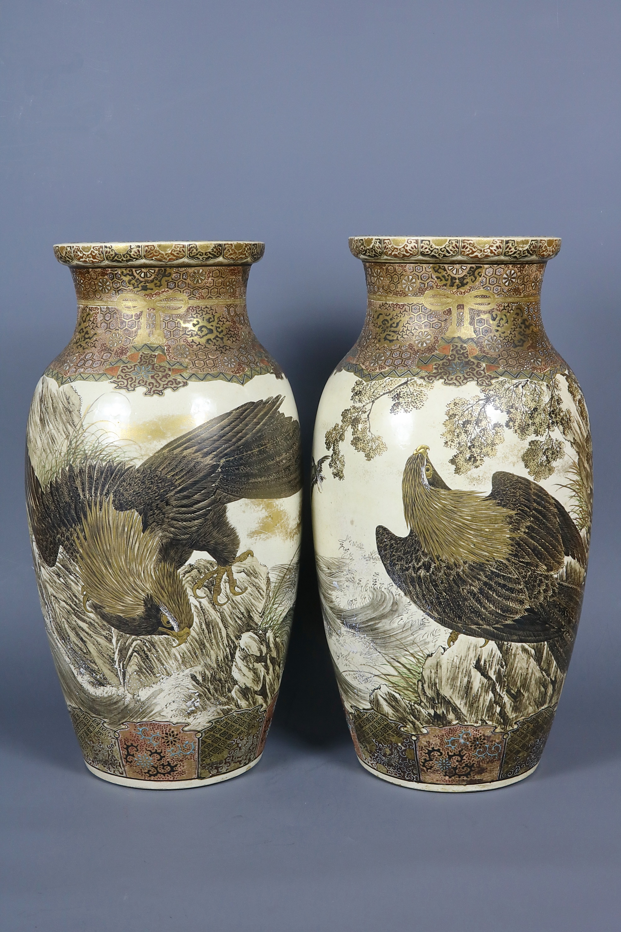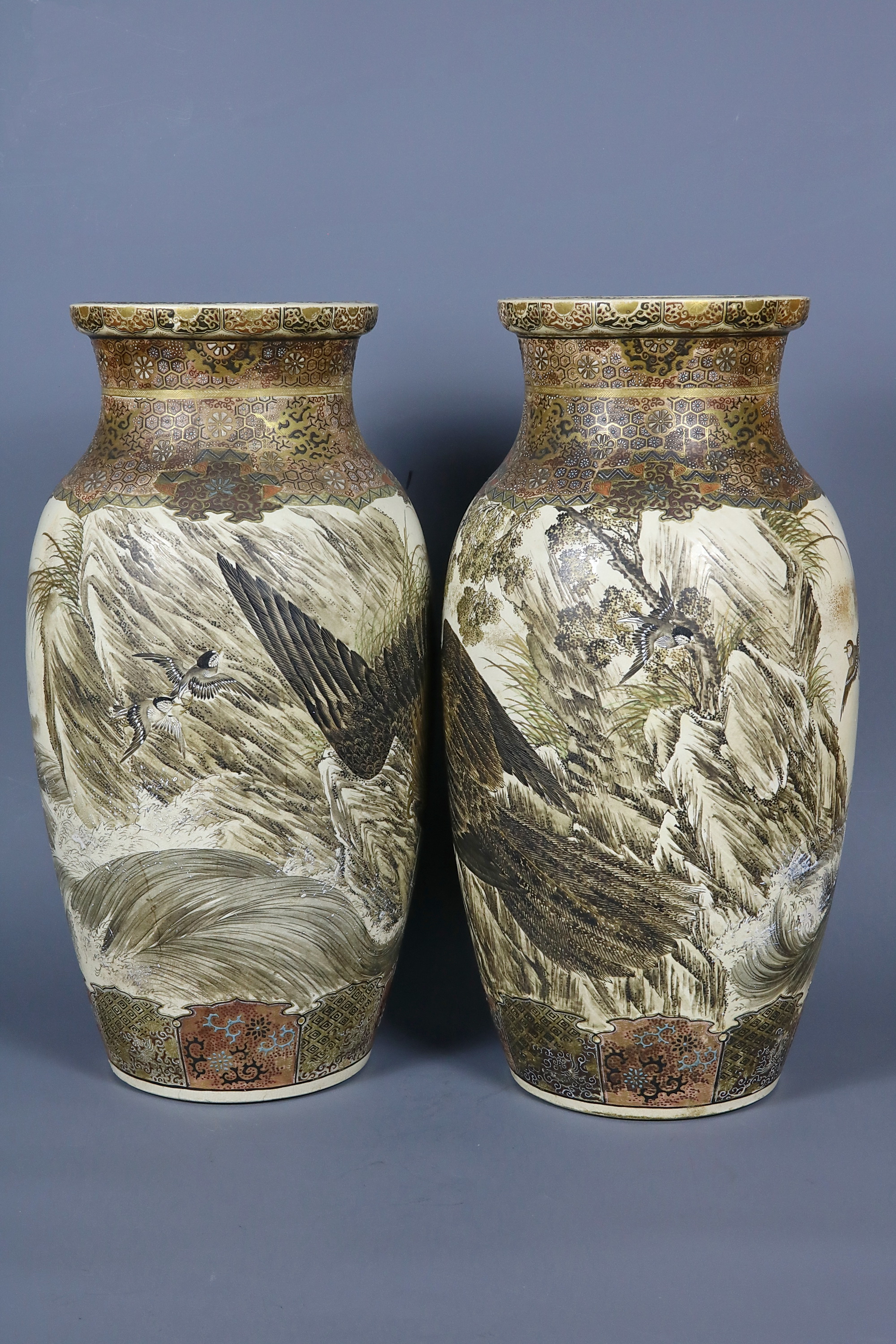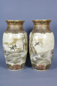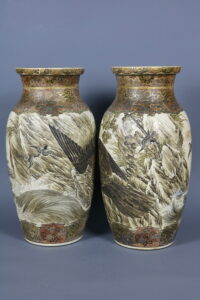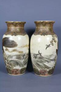Форма обоих ваз идентична, тулова овоидной формы с невысокими горловинами, заканчивающиеся небольшими раструбами. Композиционное решение парных изделий выполнено в виде круговой картины, на классический мотив «катё – га» (цветы и птицы). На передней стороне крупным планом изображены орлы у подножья гор. Орел – солярный символ, являющийся атрибутом солнечных богов во многих культурах, полуденное солнце, духовное начало, высота, вознесение, освобождение от уз, отвага, победа, гордость, апофеоз, величие, царственное происхождение, власть, сила. Орел связан со стихиями воздуха и огня; он царь в воздушном пространстве, как лев — царь зверей на земле. Птица посвящения, посланник богов, он соединяет земную и небесную сферы. На оборотной стороне изображены летящие птицы над бурлящими волнами.