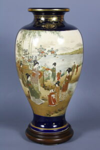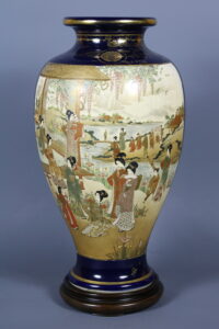 На донышке вазы в красном прямоугольнике золотом нанесена иероглифическая надпись: «Дай Нихон Мэйдзан дзо»(Великая Япония Мэйдзан создал). Маркировка свидетельствует, что ваза принадлежат к группе изделий кё-сацума, то есть киотосского фаянса в стиле сацума и создана одним из известных мастеров по росписи по фаянсу — Мэйдзан.