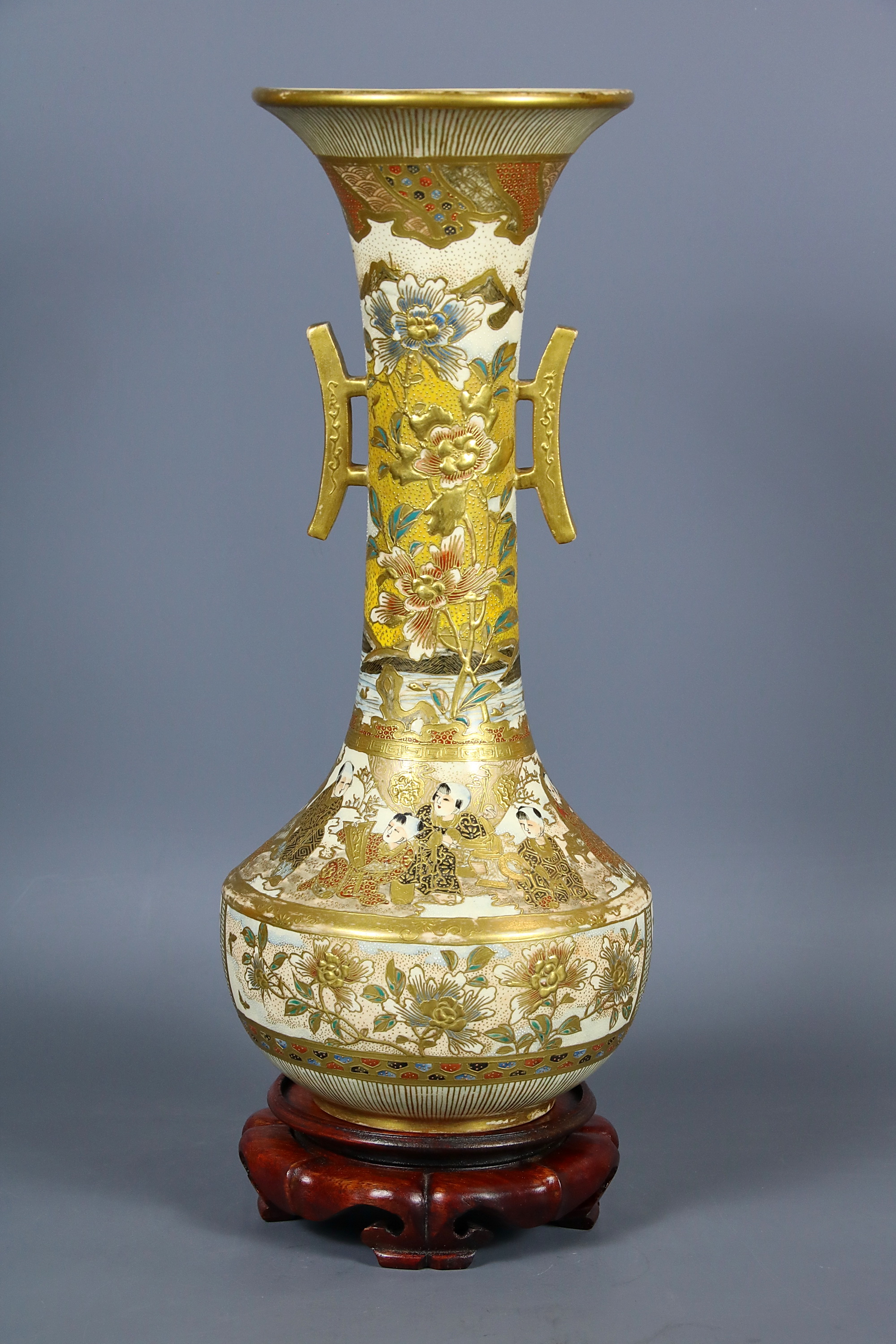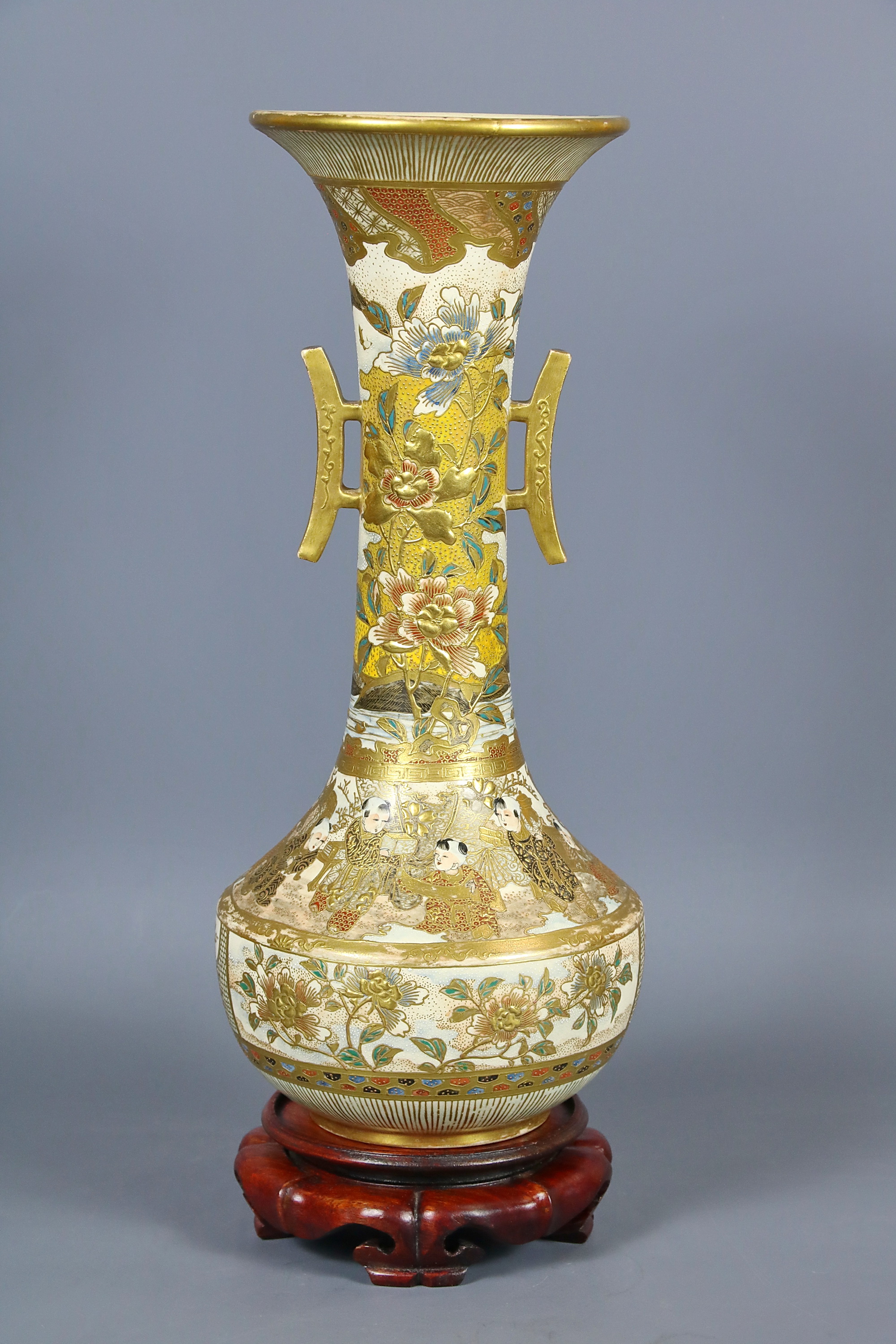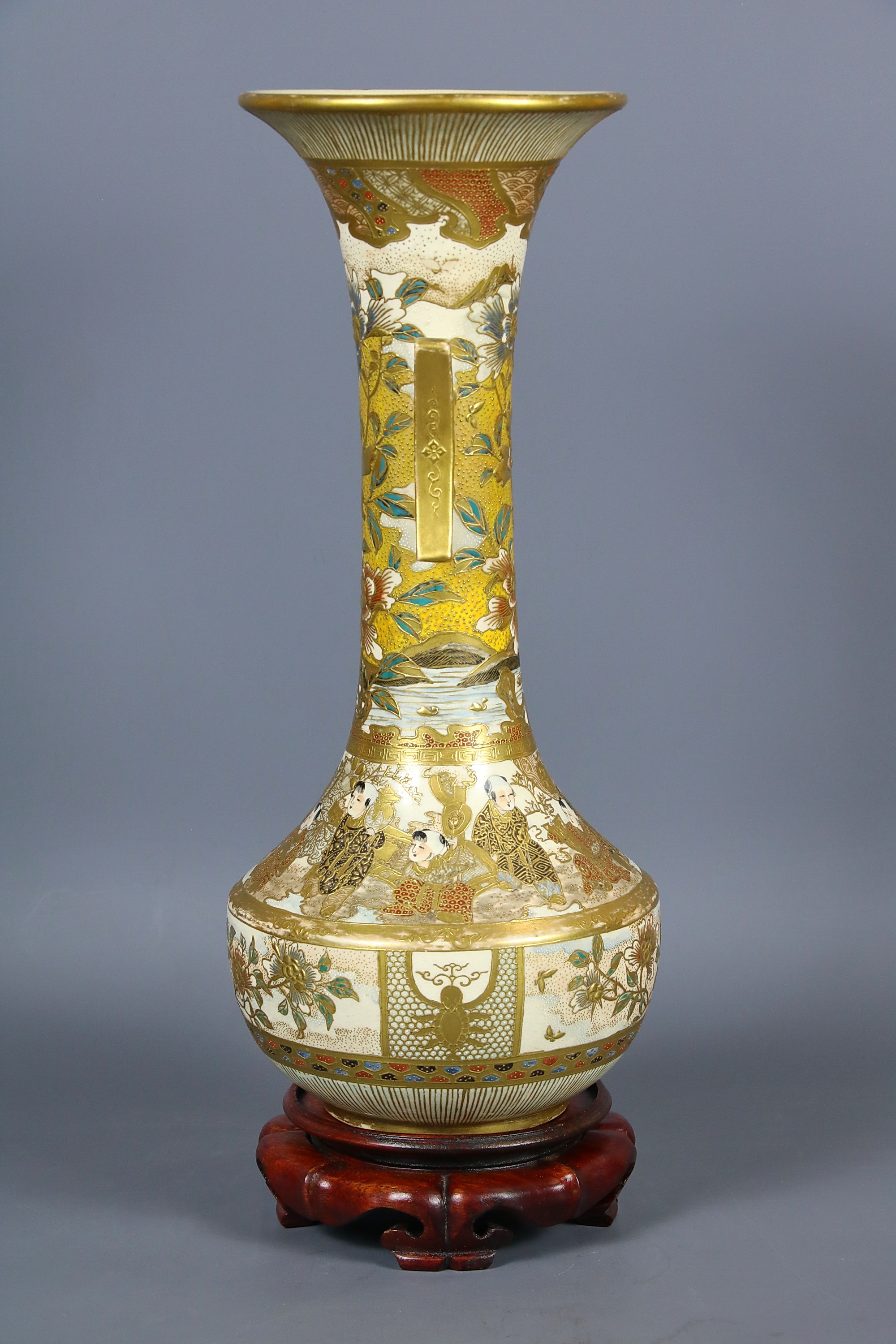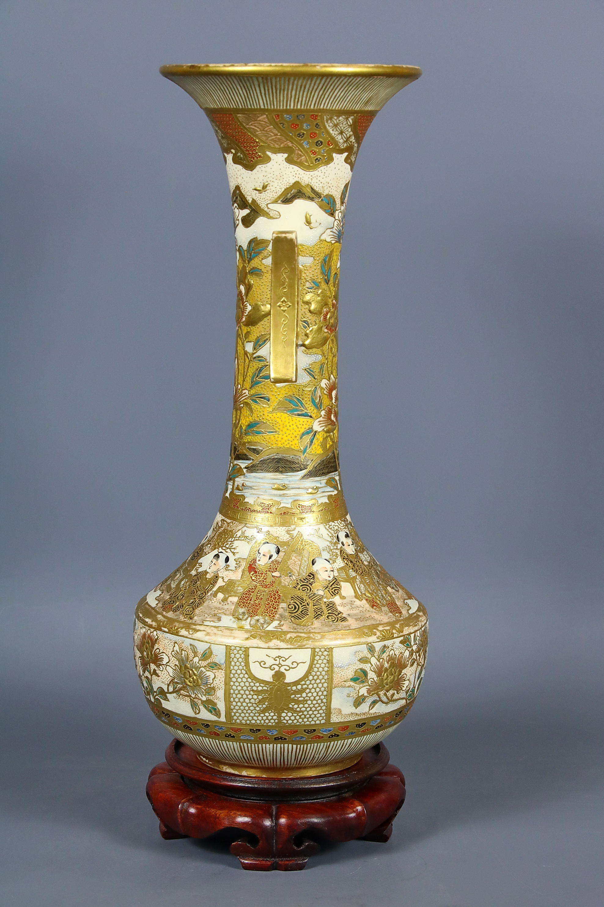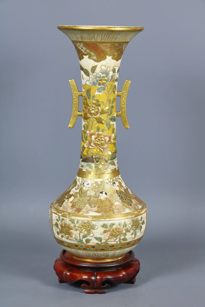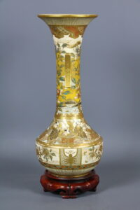 На донышке вазы золотом нанесена иероглифическая надпись: Кинкодзан дзо. Маркировка свидетельствует, что ваза принадлежат к группе изделий кё-сацума, то есть киотосского фаянса в стиле сацума и создана в мастерской Кинкодзана VII (Кобаяси Собэй 1868-1927), собравшего под своим руководством целую плеяду талантливейших декораторов. Работы Кинкодзана VII пользовались колоссальным успехом у западных любителей японского искусства.
