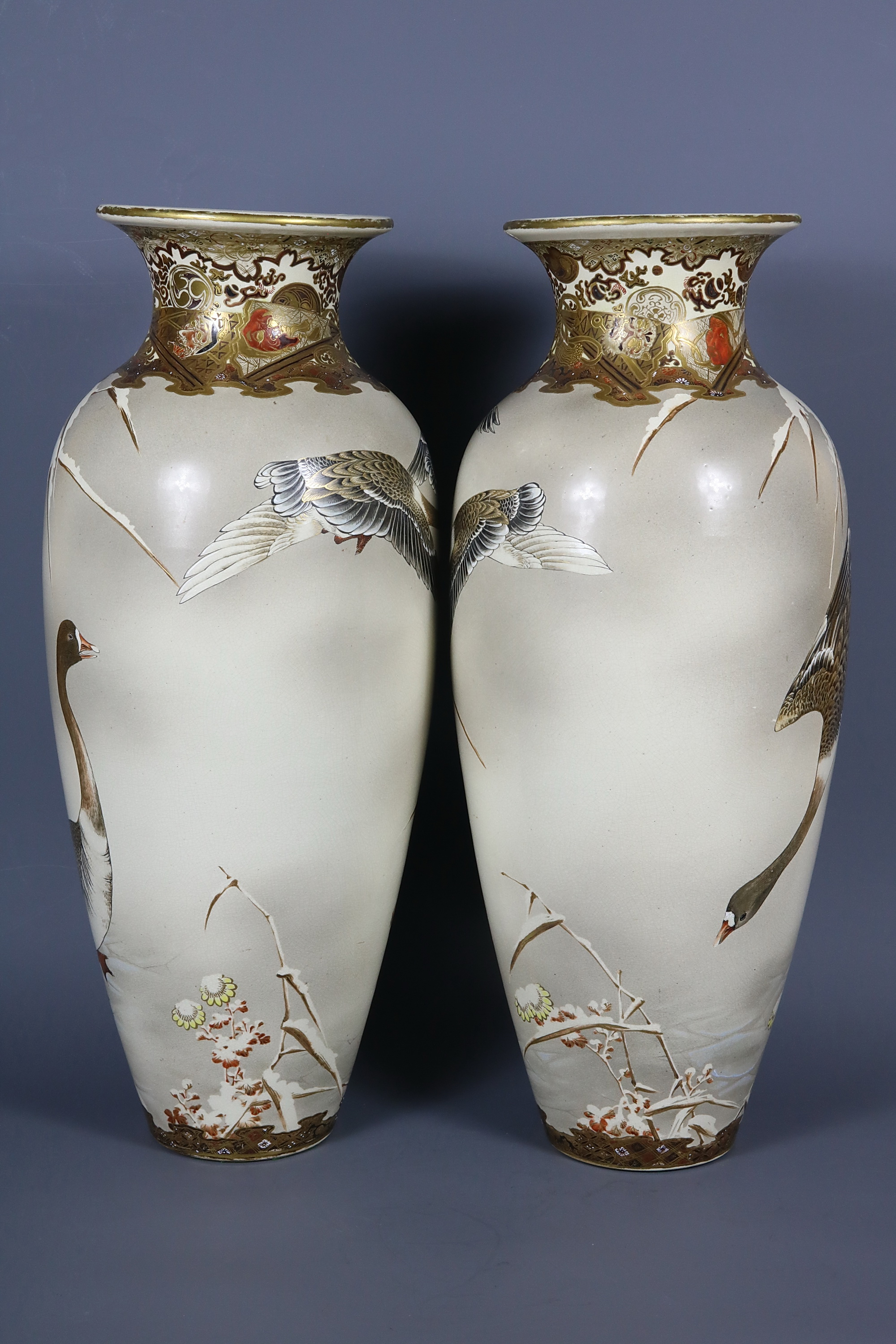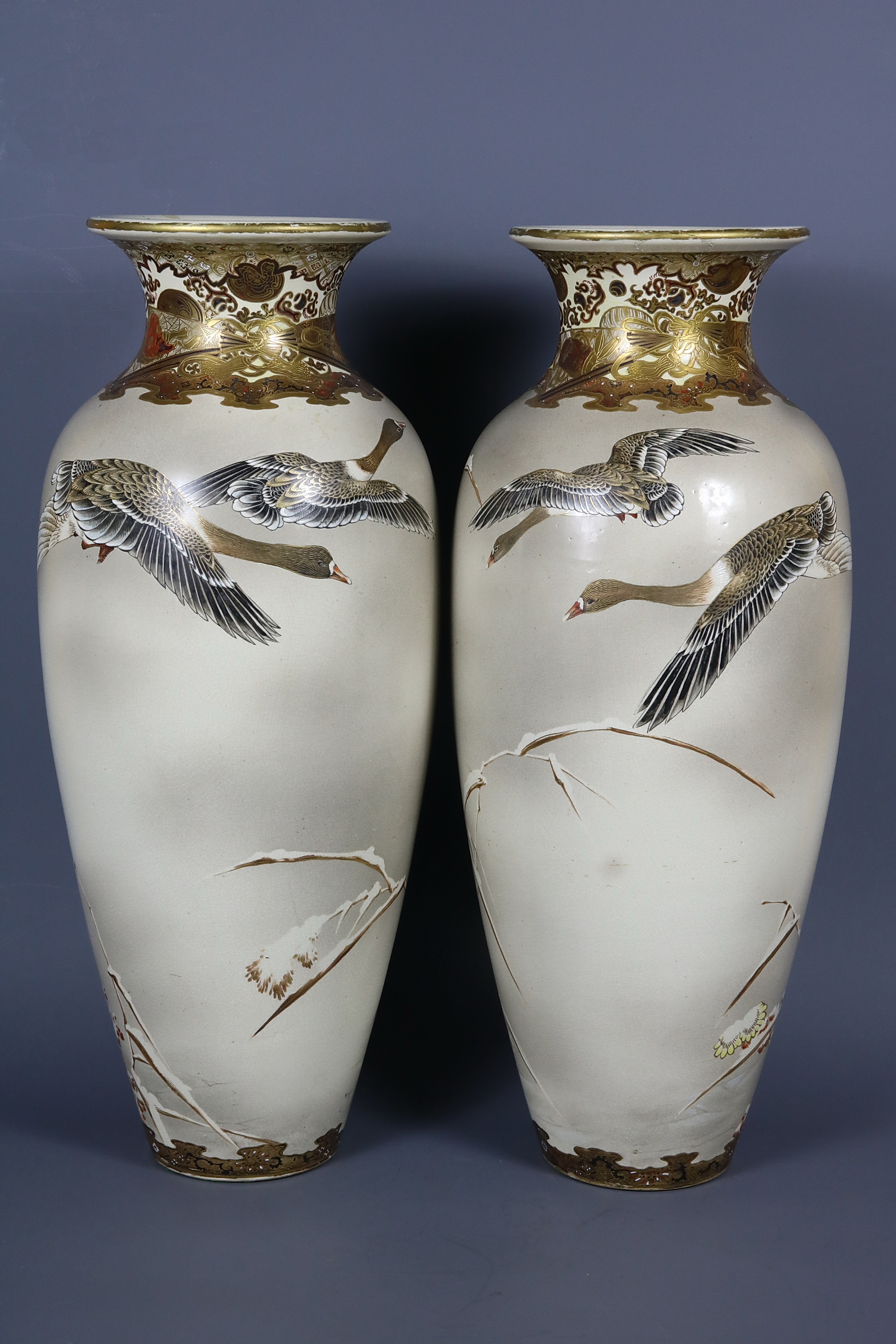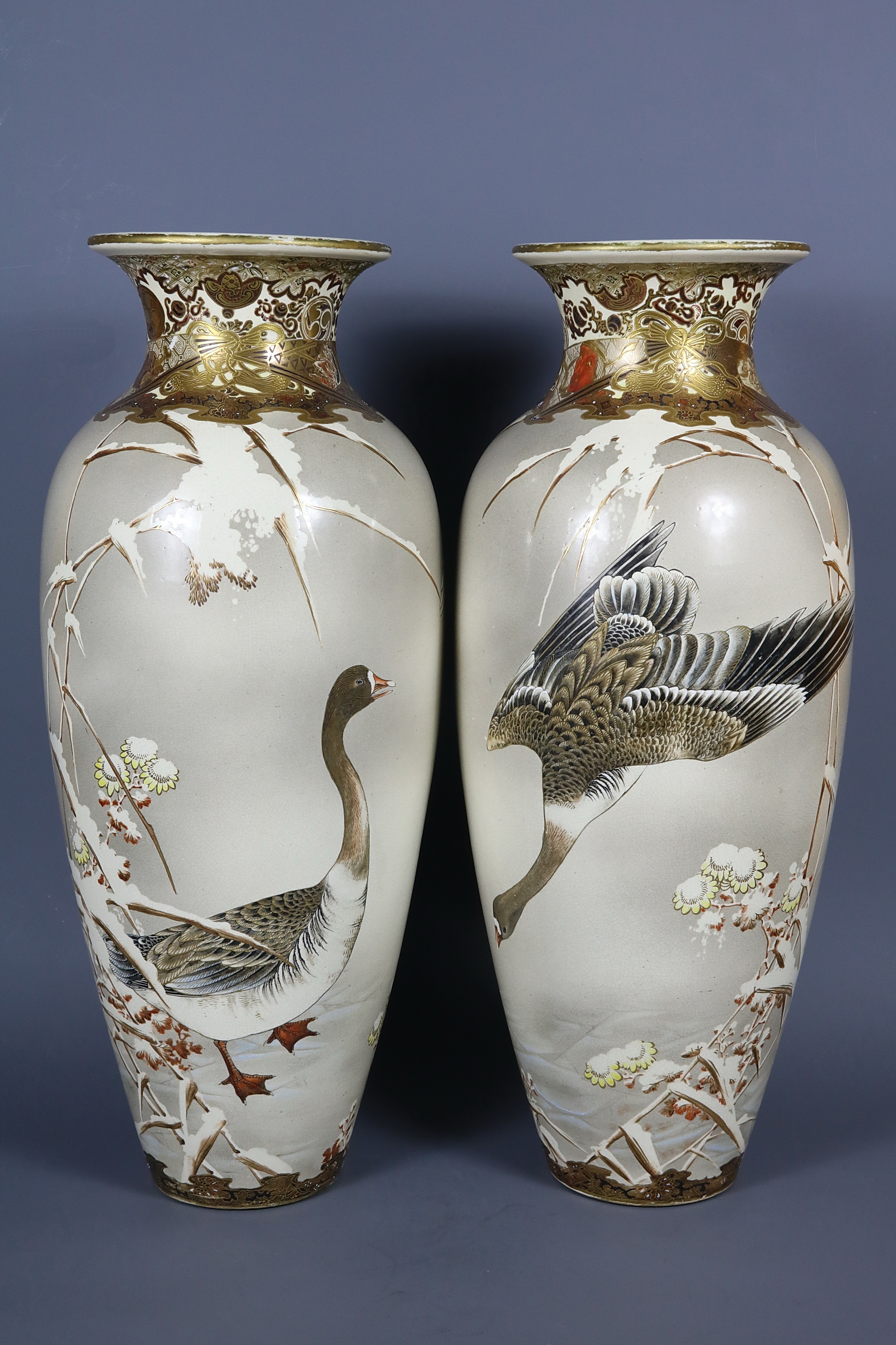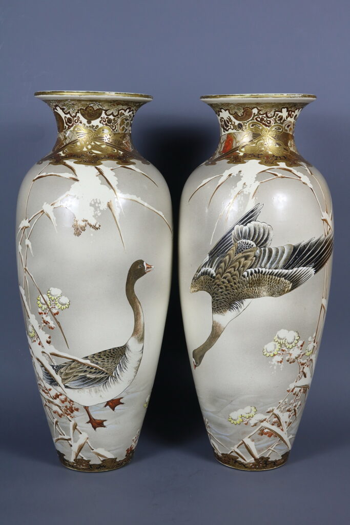 Роспись ваз создана в жанре катё-га («цветы и птицы») под сильным влиянием классической японской живописи. Обе вазы смотрятся как традиционная пара вертикальных свитков или как створки одной ширмы. Живописец воссоздает поэтичный образ предзимья японской природы — жемчужно-серое небо, засыпанный первым влажным снегом бамбук, желтые как редкий луч солнца последние хризантемы зангику и, наконец, два гуся, один из которых стоит на земле, а другой пикирует с неба. Картины на фаянсе выполнены в стиле тансай («бледно-окрашенные»), когда преобладает тушевой рисунок, в данном случае мастер использует черный железный краситель, с помощью которого создаются различные тональные переходы.