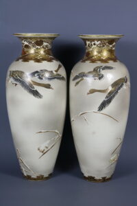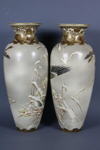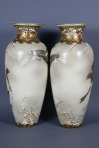 Настоящие изделия являются образцами японской фаянсовой продукции, выполненными в стиле сацума, который сложился в одноименной исторической провинции (совр. префектура Кагосима) во второй половине XIX века. К концу столетия, распространившись по всей стране, он стал своеобразной визитной карточкой Японии. Это парные вазы идентичной формы с цилиндрическим туловом и плавно закругляющимся оплечьем. Цилиндрическое горло завершается раструбом.