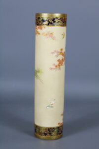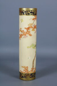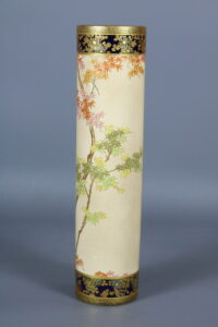 Вазочка вытянутой, цилиндрической формы, у горла и ножки декорирована цветками хризантемы на черном фоне. Круговая роспись тулова декорирована изображением японского клена.