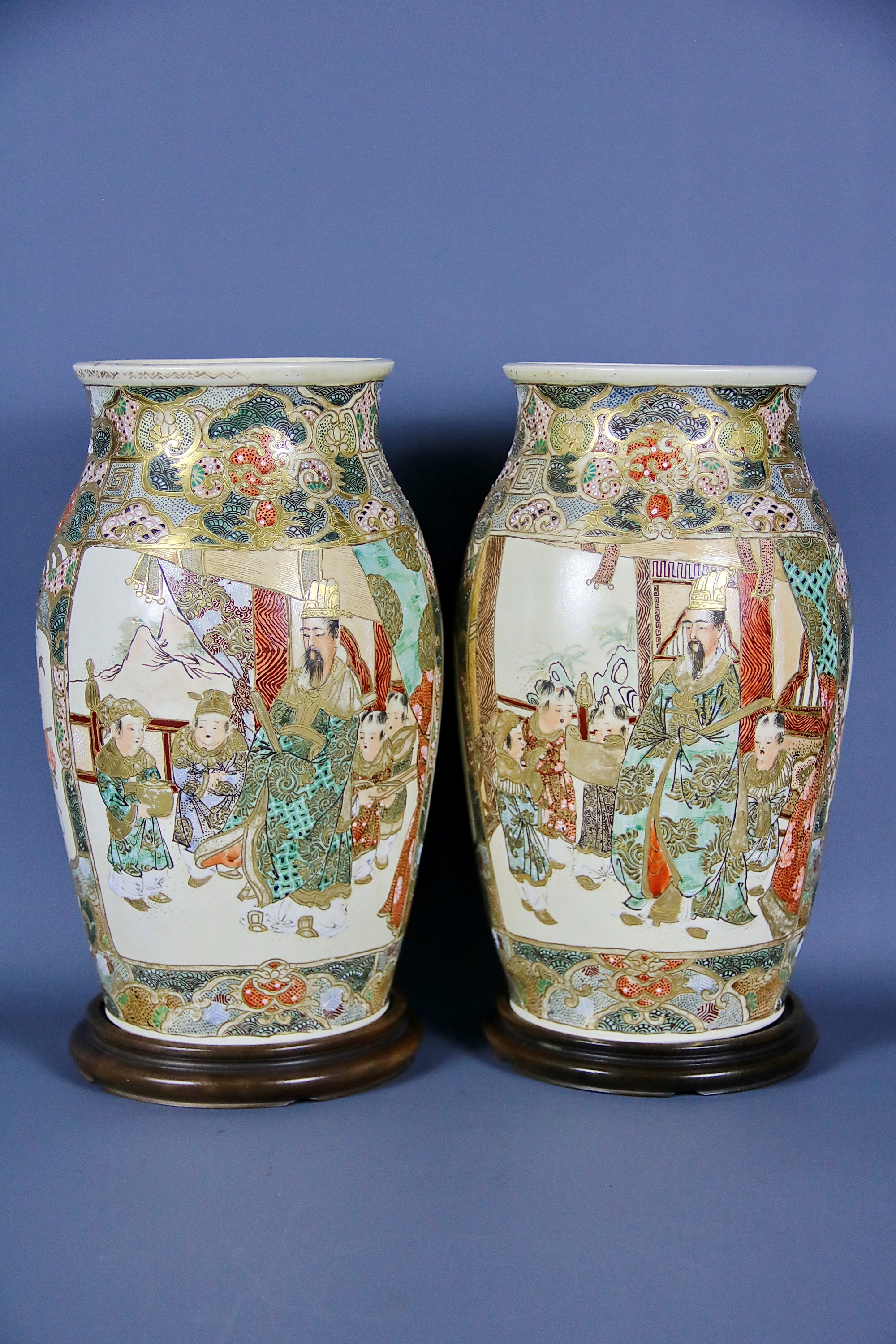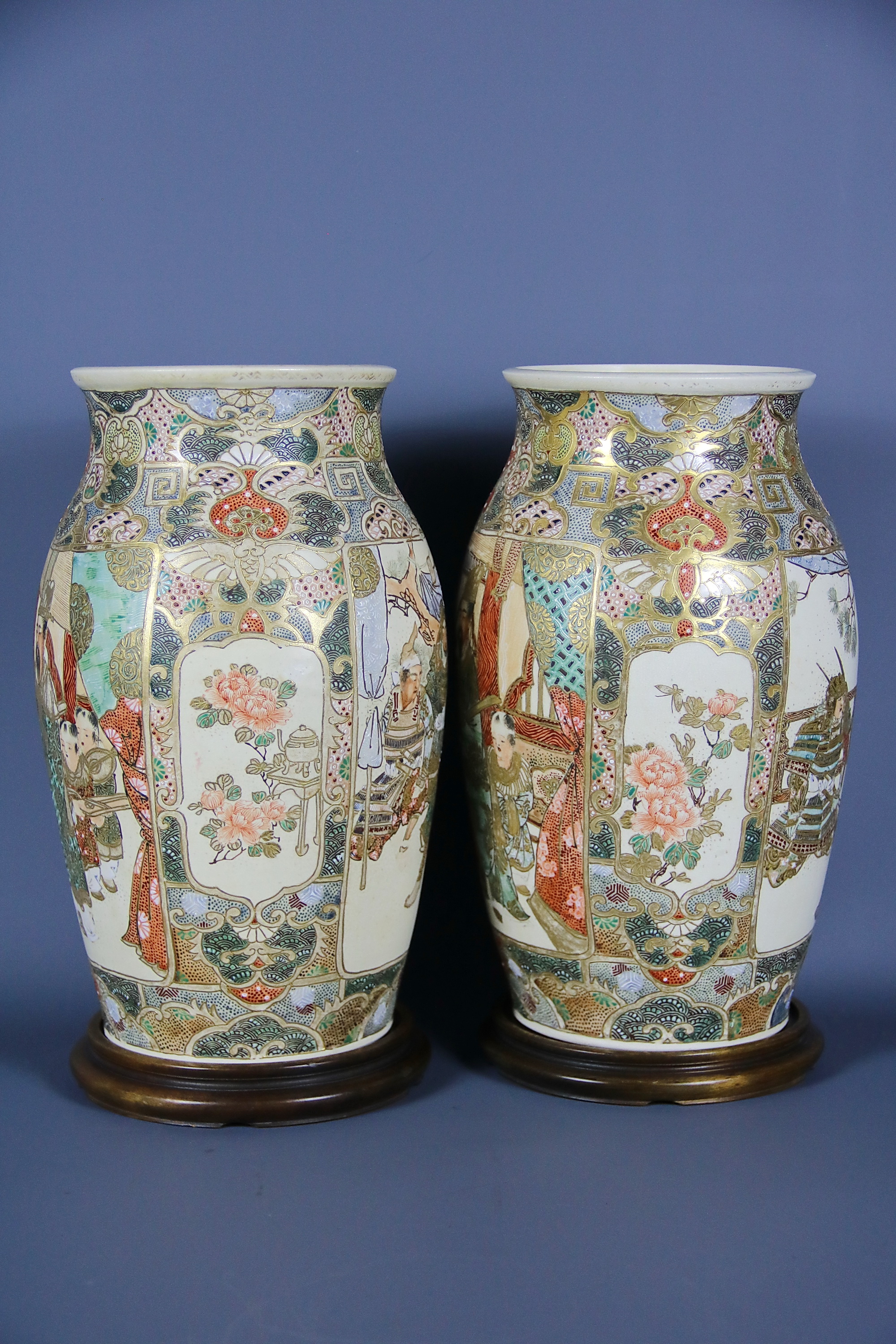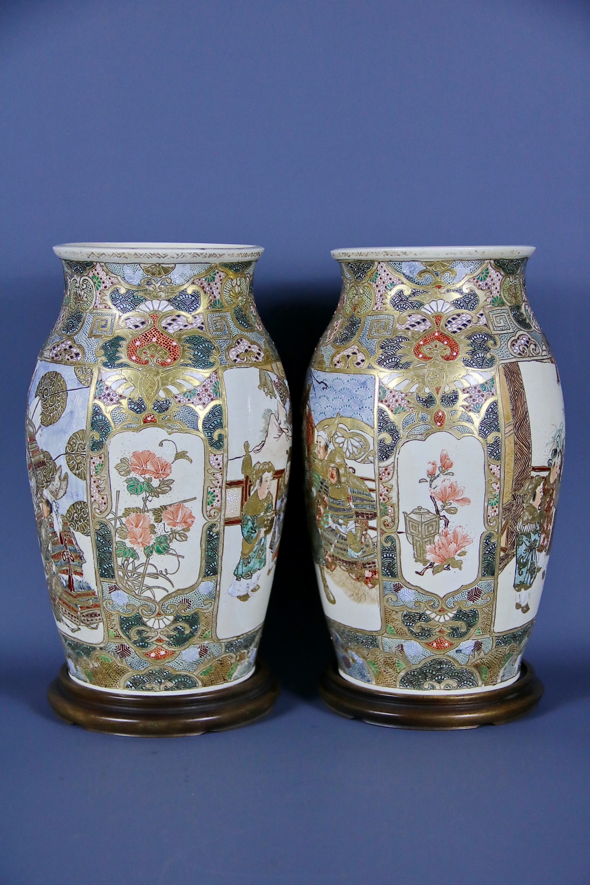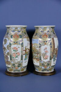 Декорация, как и форма обеих ваз идентична. Композиционное решение парных изделий выполнено в виде двух картушей, на которых с лицевой стороны изображены сцены из жизни самураев — японской аристократической знати средневековья. На оборотной стороне изображена сцена из придворной жизни.