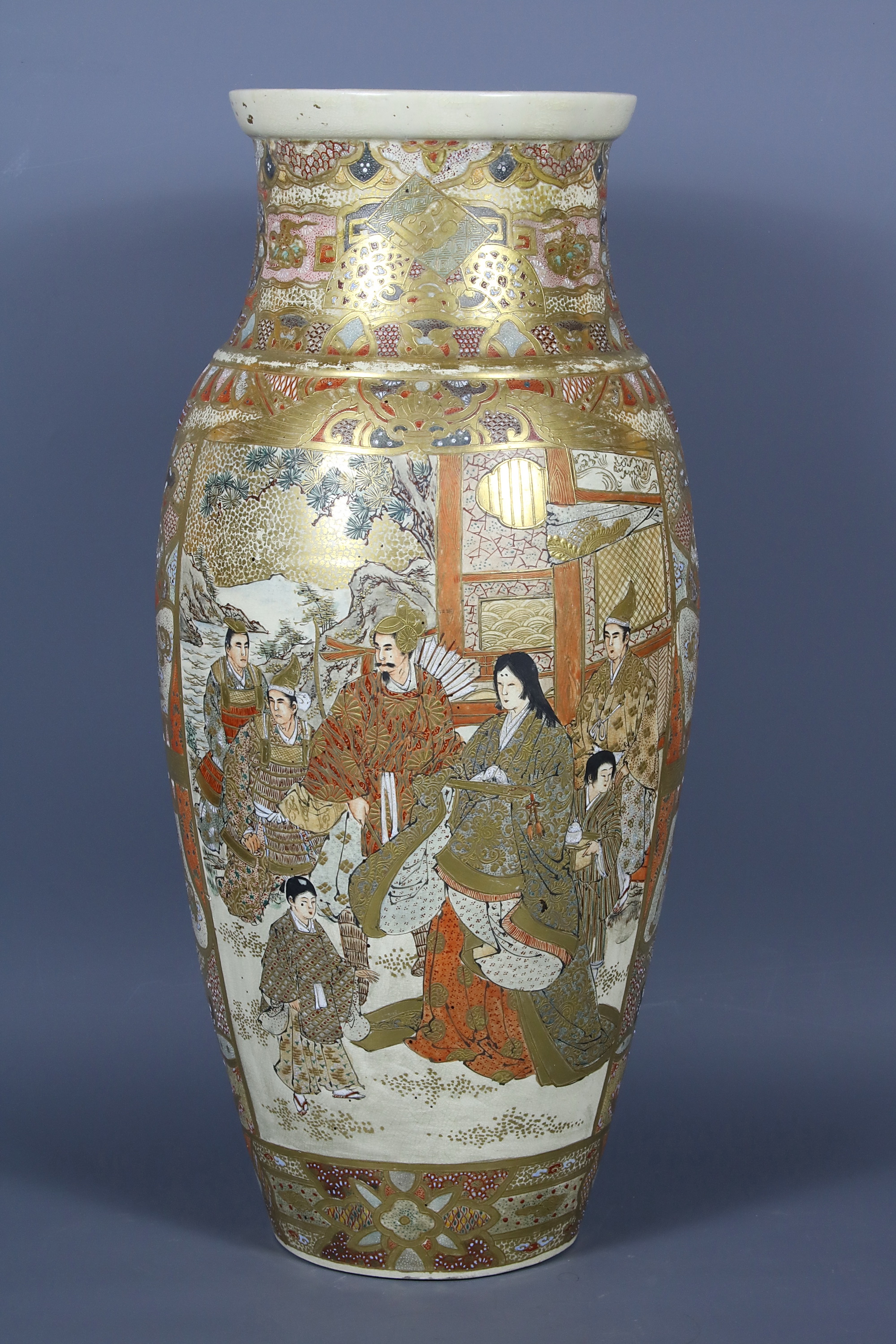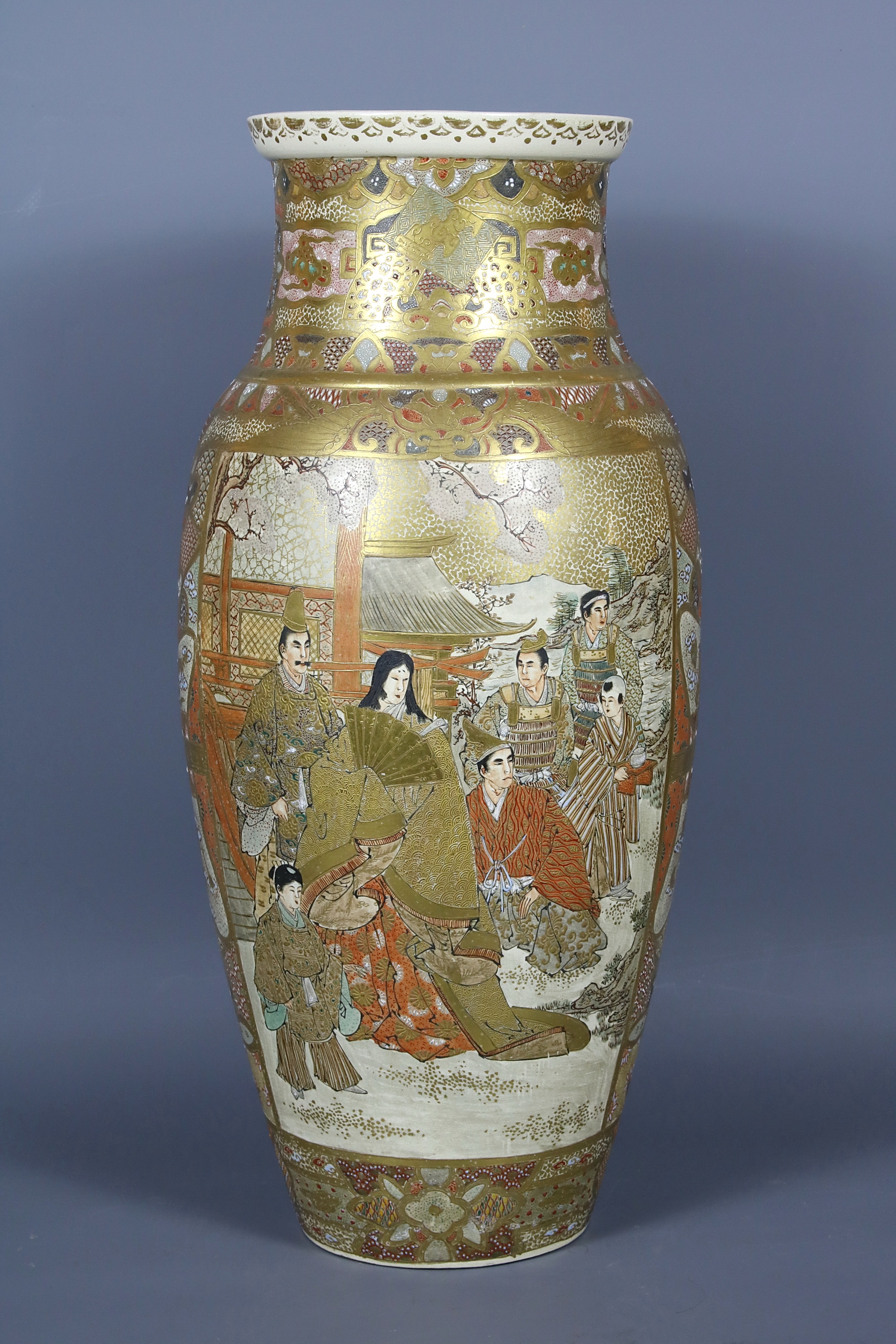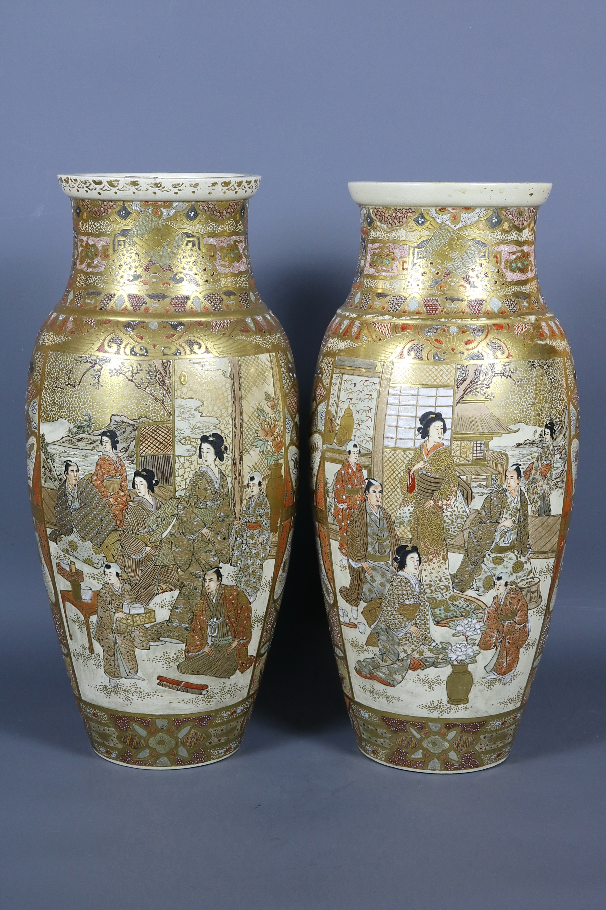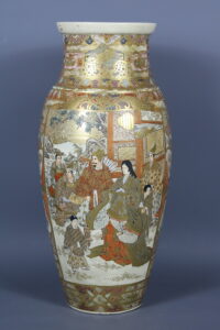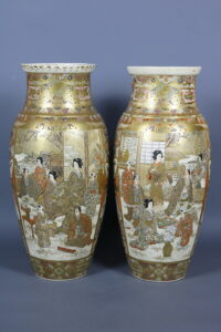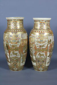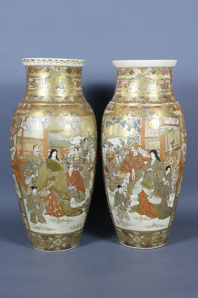 Вазы выполнены в форме балясин, с короткими, слегка расширяющимися горловинами. Круговая роспись ваз выполнена в виде двух картушей. На картушах с лицевой и оборотной стороны изображения самураев, придворных дам и детей у павильонов на фоне ландшафта. На оплечьях, горловинах и боках, разделяющих картуши — растительные и геометрические орнаменты.