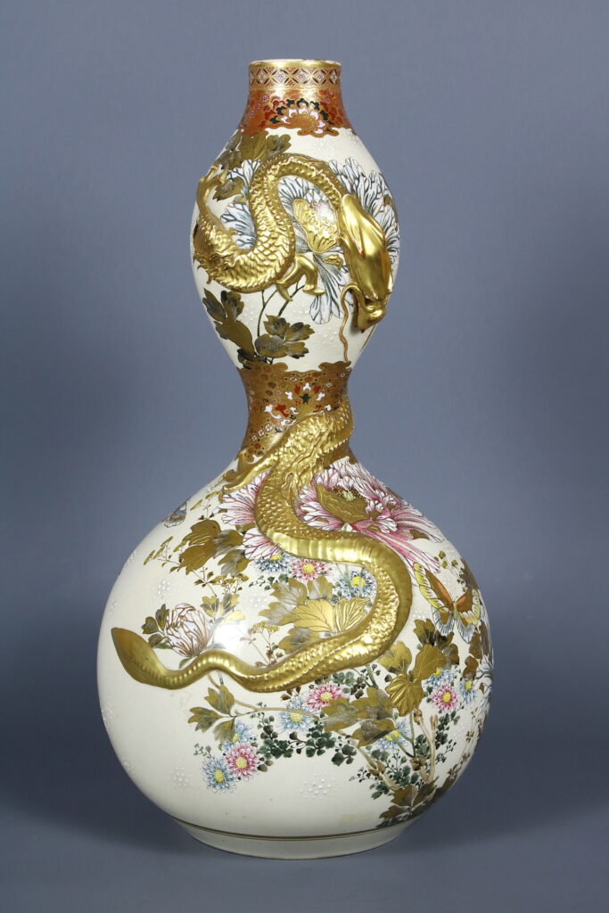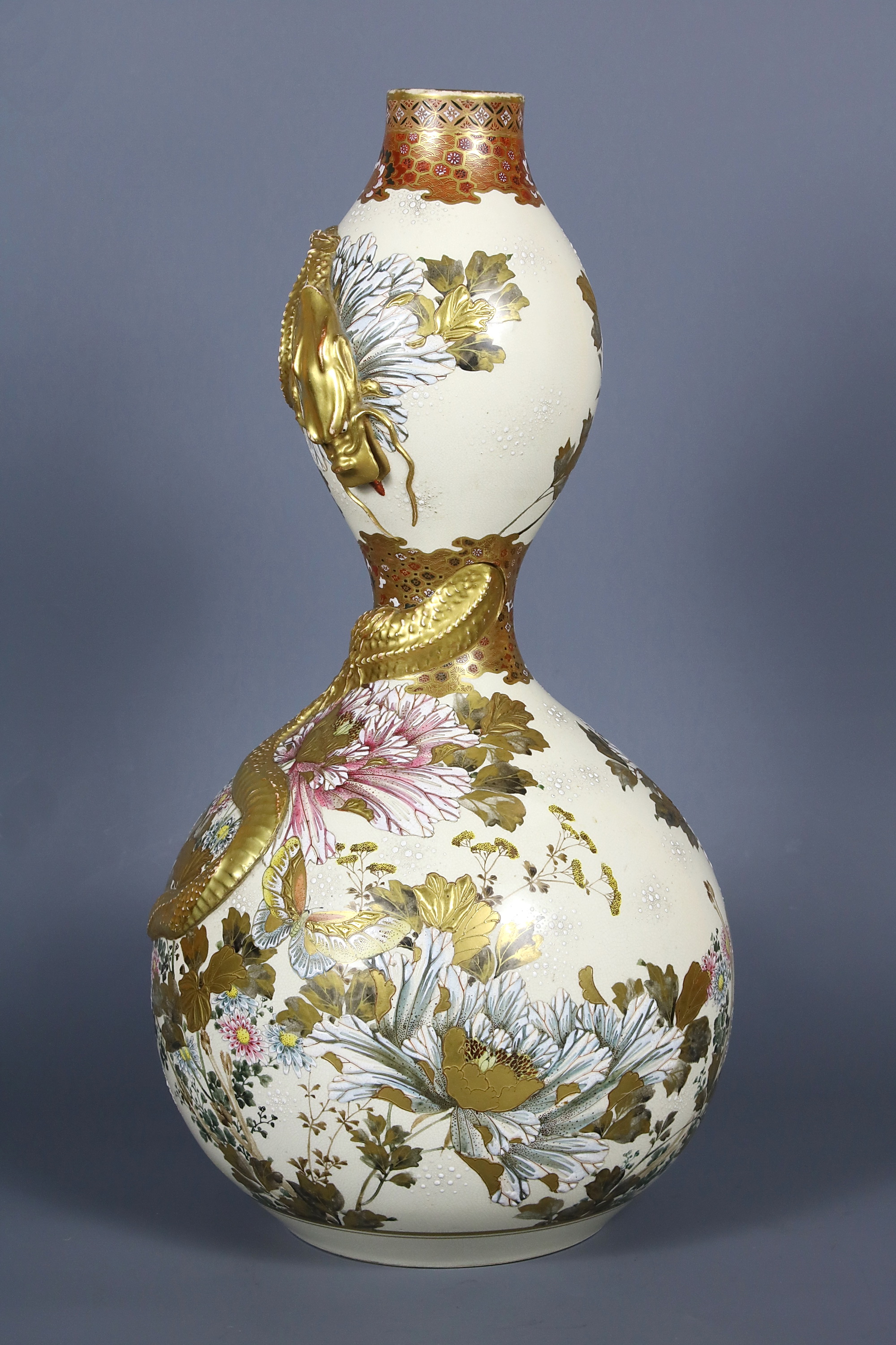 Данное изделие представляет собой изящную вазу в виде тыквы горлянки. Туловище вазы обвивает дракон, который выполнен в технике барельефа и горельефа. Фантастическая рептилия запечатлена извивающейся над кустом цветов.