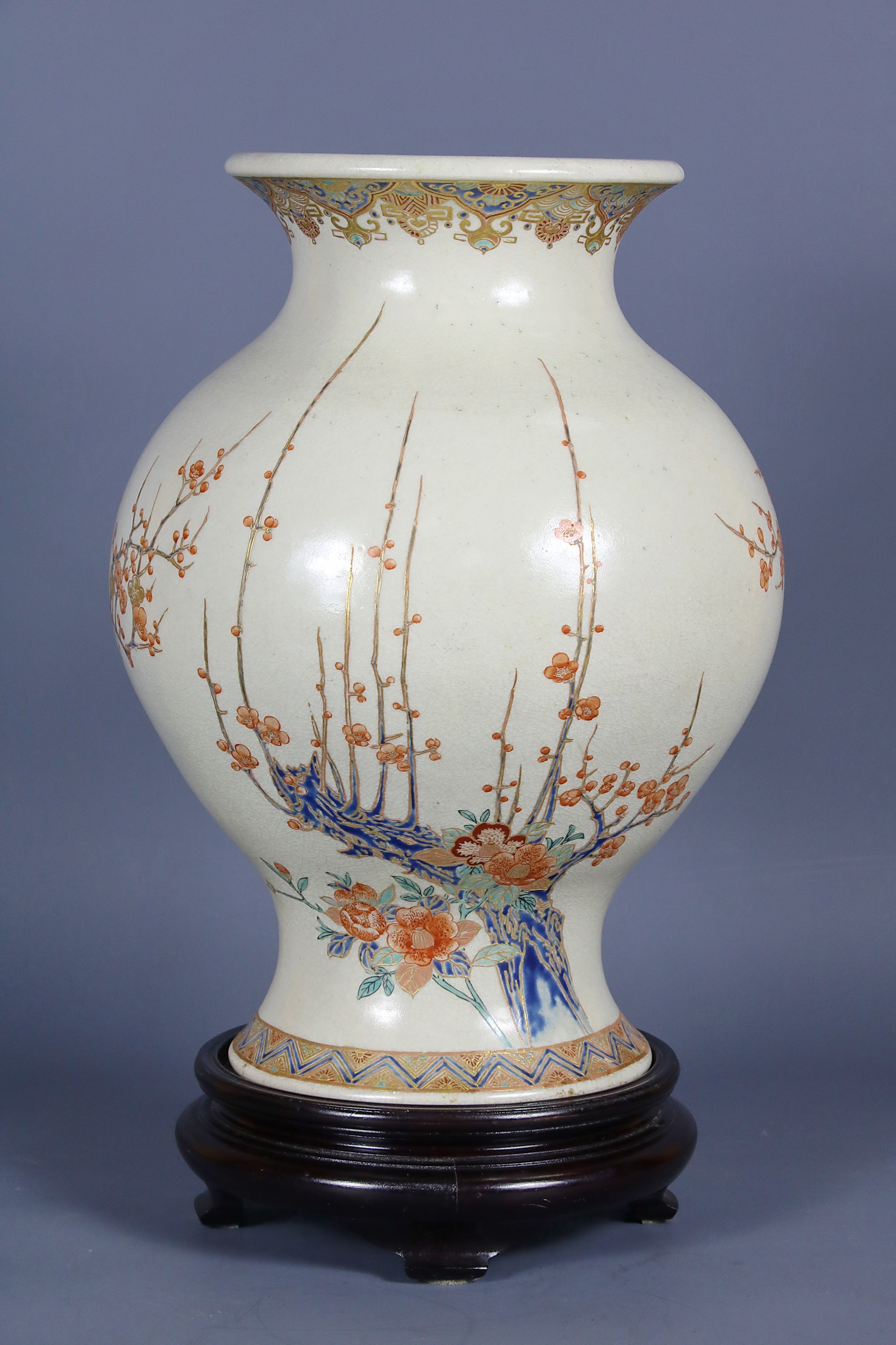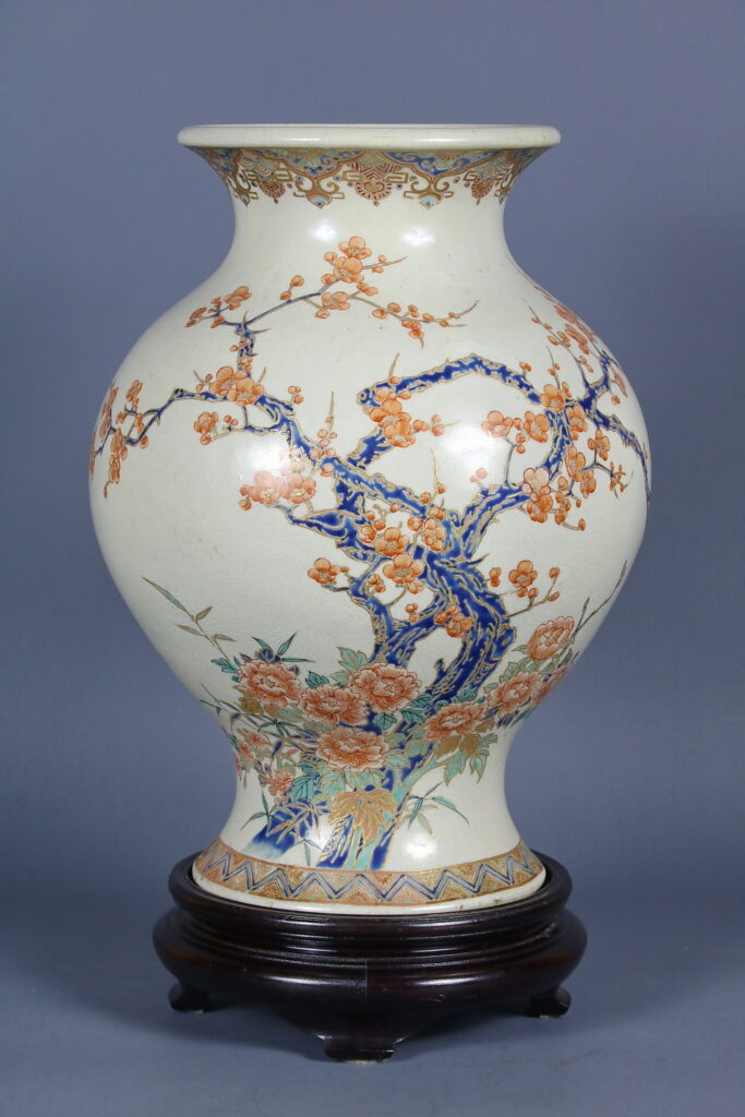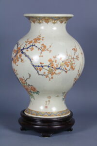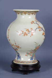 Данный предмет – это декоративная ваза овоидной формы с низкой горловиной в виде раструба и расширяющейся книзу ножке. Тело вазы спереди украшено деревом цветущей сливы и древовидного пиона. На тыльной стороне вазы изображена старая ветка сливы с молодыми цветущими побегами и цветами пиона. Раструб горловины и основание ножки декорированы геометрическими орнаментами.