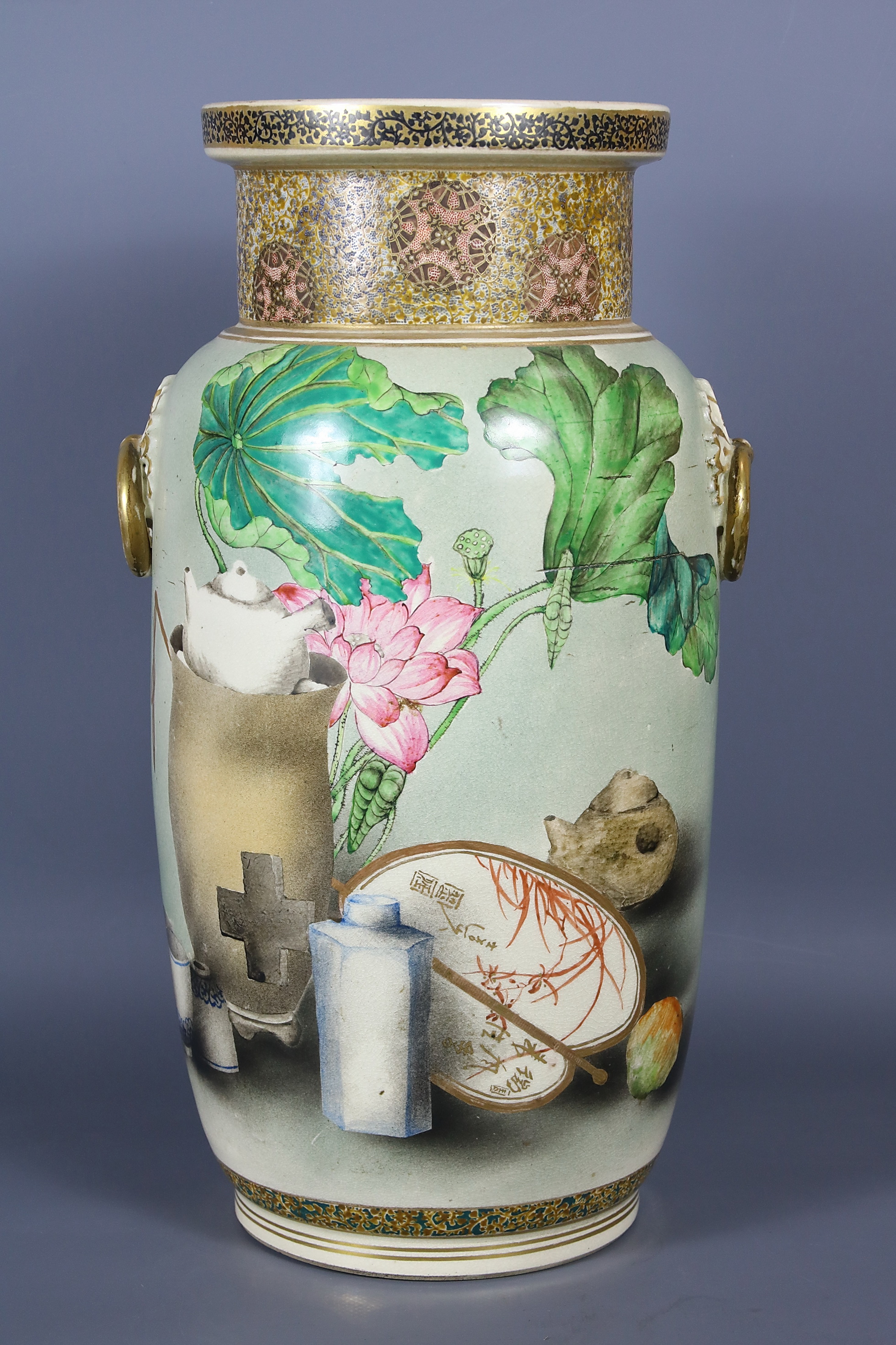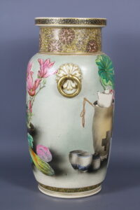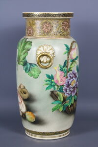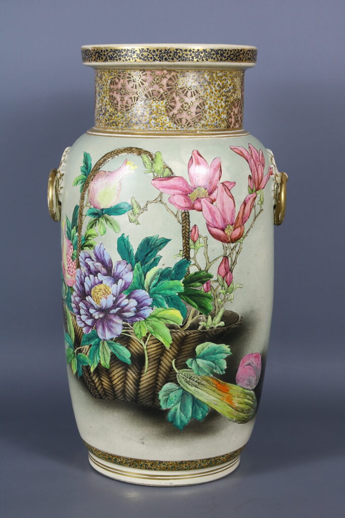 Маркировка свидетельствует о том, что ваза принадлежит к группе киотских изделий в стиле сацума созданных в мастерской Кинкодзана VII (Кобаяси Собэй 1868-1927), собравшего под своим руководством целую плеяду талантливейших декораторов. Работы Кинкодзана VII пользовались колоссальным успехом у западных ценителей японского искусства, которые особо восхищались экзотичностью и причудливой декоративностью подобных ваз, служивших достойным украшением интерьеров загородных вилл и особняков.
