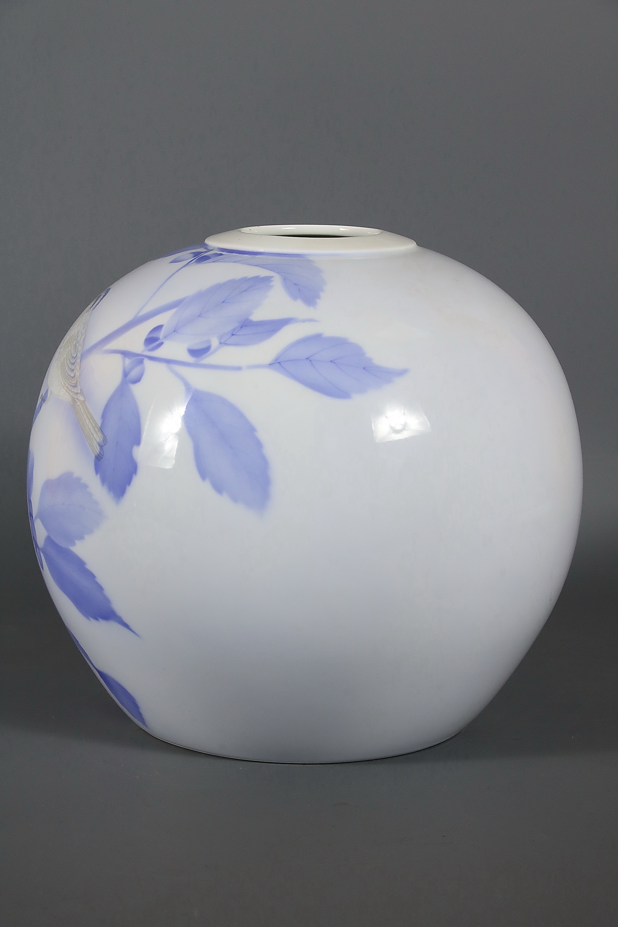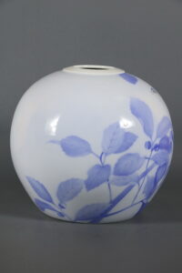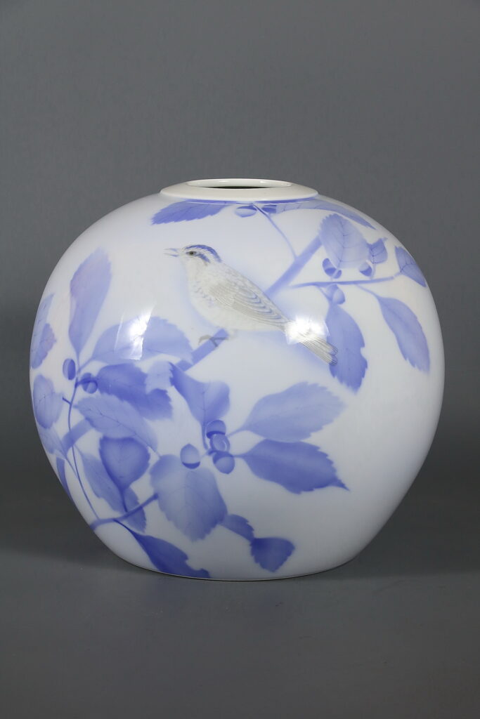 Представленное произведение это шарообразная ваза с изображением птички на ветке фундука, которая принадлежит к изделиям Fukagawa 深 川 провинции Арита 有 田 焼. отличает мягкий цвет, пастельный оттенок росписи фарфора. На донышке вазы подпись под глазурью «Kanyo Sometsuke» 官窯 染 付, и символ Фудзи с волнами, используемый для маркировки Fukagawa; это обозначение буквально означает, «Империал бело-голубой». ‘Somestuke’, ссылается на классический китайский «бело-голубой» 青花 фарфор. Очевидно, что мы имеем более насыщенную цветовую гамму, чем просто синий и белый, поэтому этот термин, был очень слабо, применяем к изделиям Фукагава, где используется очень целомудренный и почти минималистский вкус в выборе палитры.