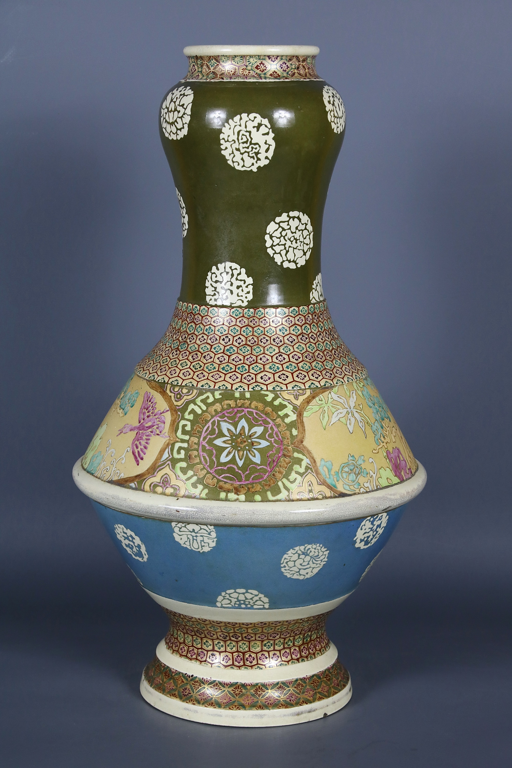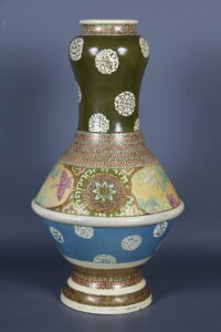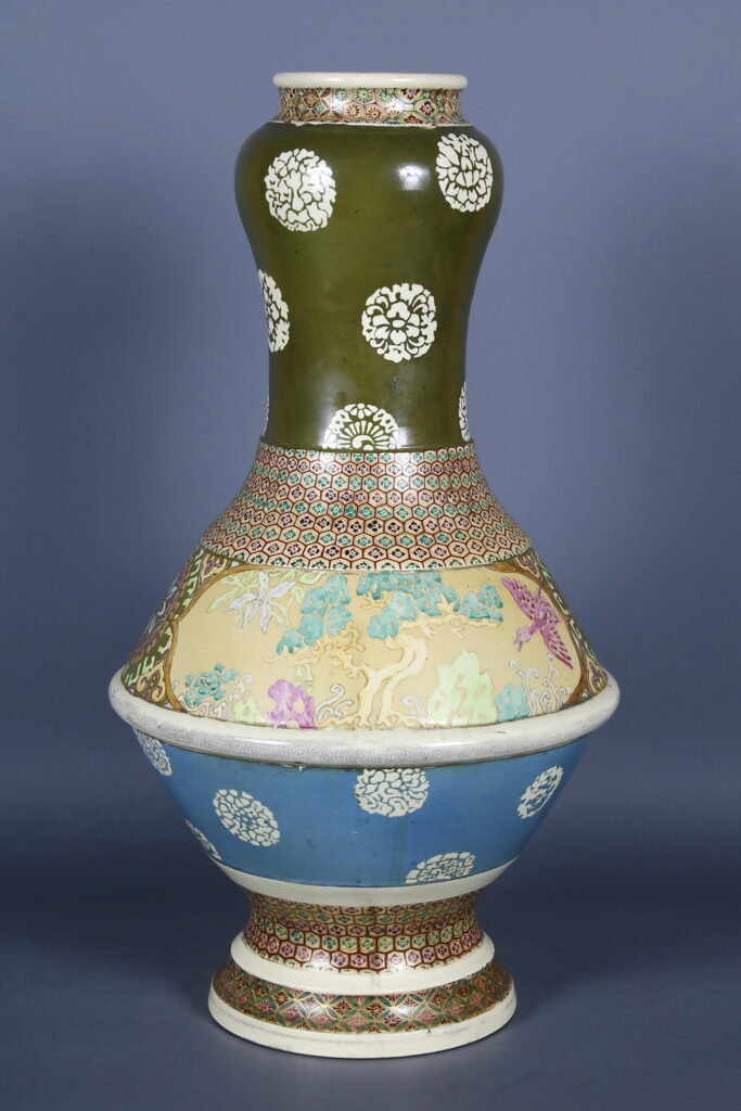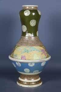 Маркировка свидетельствует о том, что ваза принадлежит к группе киотских изделий в стиле сацума созданных в мастерской Кинкодзана VII (Кобаяси Собэй 1868-1927), собравшего под своим руководством целую плеяду талантливейших декораторов. Работы Кинкодзана VII пользовались колоссальным успехом у западных ценителей японского искусства, которые особо восхищались экзотичностью и причудливой декоратиивностью подобных ваз, служивших достойным украшением интерьеров загородных вилл и особняков.