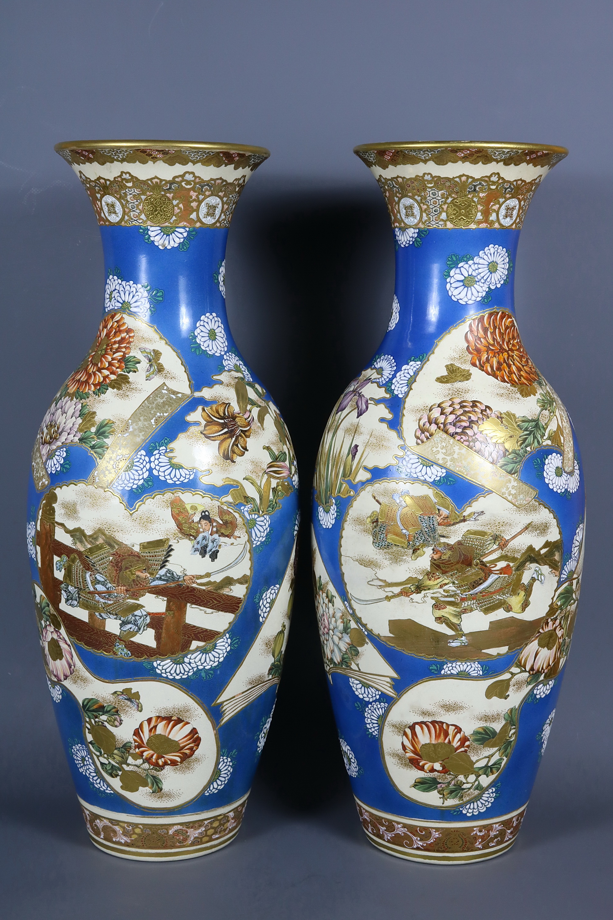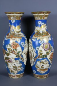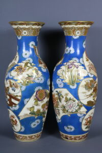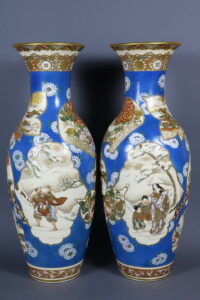 Декорация, как и форма обеих ваз идентична. Композиционное решение парных изделий выполнено в виде девяти картушей разных форм (веер, тыква-горлянка, книга, цветок, облако и тп.), на которых изображены сцены из жизни самураев, японской аристократической знати а также цветы и птицы.