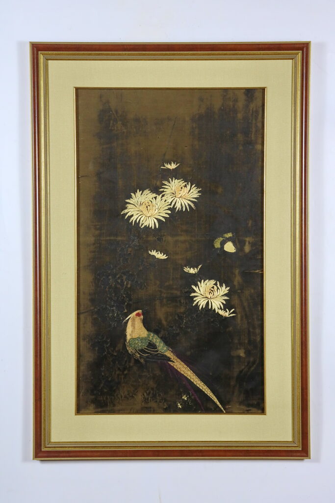 Вышивка представляет характерный образец текстиля конца XIX начала XX вв. В последней трети XIX века, Япония стала активным участником международных выставок, где представляла произведения разных видов декоративно-прикладного искусства, в числе которых были и разнообразные вышивки. Используя традиционные приемы вышивания, с раннего времени (с VII-VIII вв) применяемые, в первую очередь, для декорирования одежды, мастера периода Мэйдзи (1868-1912), стали создавать эффектные живописные композиции в виде самостоятельных произведений, т.е. вышитые изделия стали станковыми произведениями. Появился новый термин бидзюцу оримоно («текстильное искусство»).