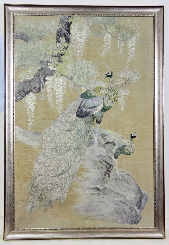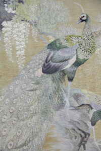 Вышивка представляет характерный образец текстиля конца XIX начала XX в. В последней трети XIX в. Япония стала активным участником международных выставок, где представляла произведения разных видов декоративно-прикладного искусства, в числе которых были и разнообразные вышивки. Используя традиционные приемы вышивания, с раннего времени (с 7-8 вв) применяемые, в первую очередь, для декорирования одежды, мастера периода Мэйдзи стали создавать эффектные живописные композиции в виде самостоятельных произведений, т.е. вышитые изделия стали станковыми произведениями. Появился новый термин бидзюцу оримоно («текстильное искусство»).