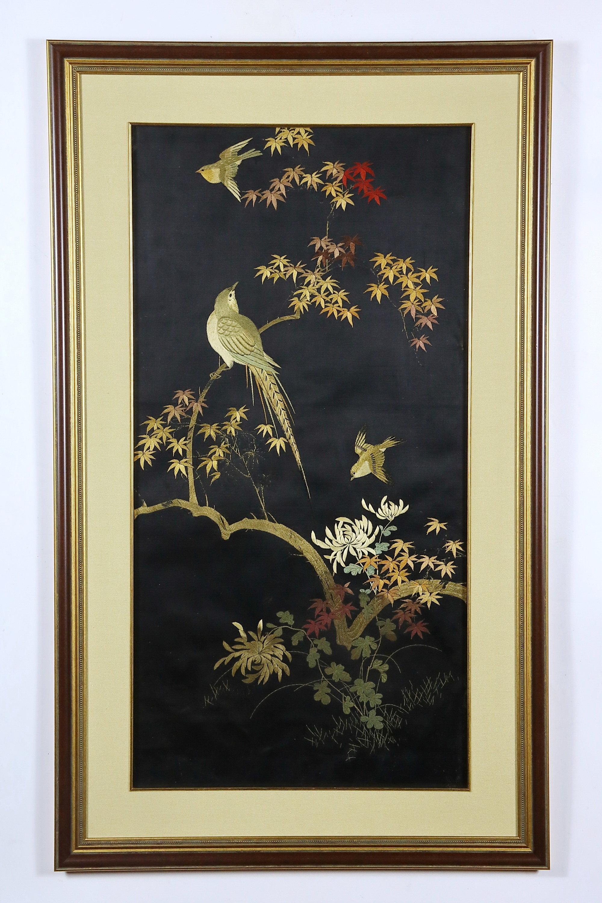 Вышивка представляет характерный образец текстиля конца XIX начала XX вв. В последней трети XIX века, Япония стала активным участником международных выставок, где представляла произведения разных видов декоративно-прикладного искусства, в числе которых были и разнообразные вышивки. Используя традиционные приемы вышивания, с раннего времени (с VII-VIII вв) применяемые, в первую очередь, для декорирования одежды, мастера периода Мэйдзи (1868-1912), стали создавать эффектные живописные композиции в виде самостоятельных произведений, т.е. вышитые изделия стали станковыми произведениями. Появился новый термин бидзюцу оримоно («текстильное искусство»).