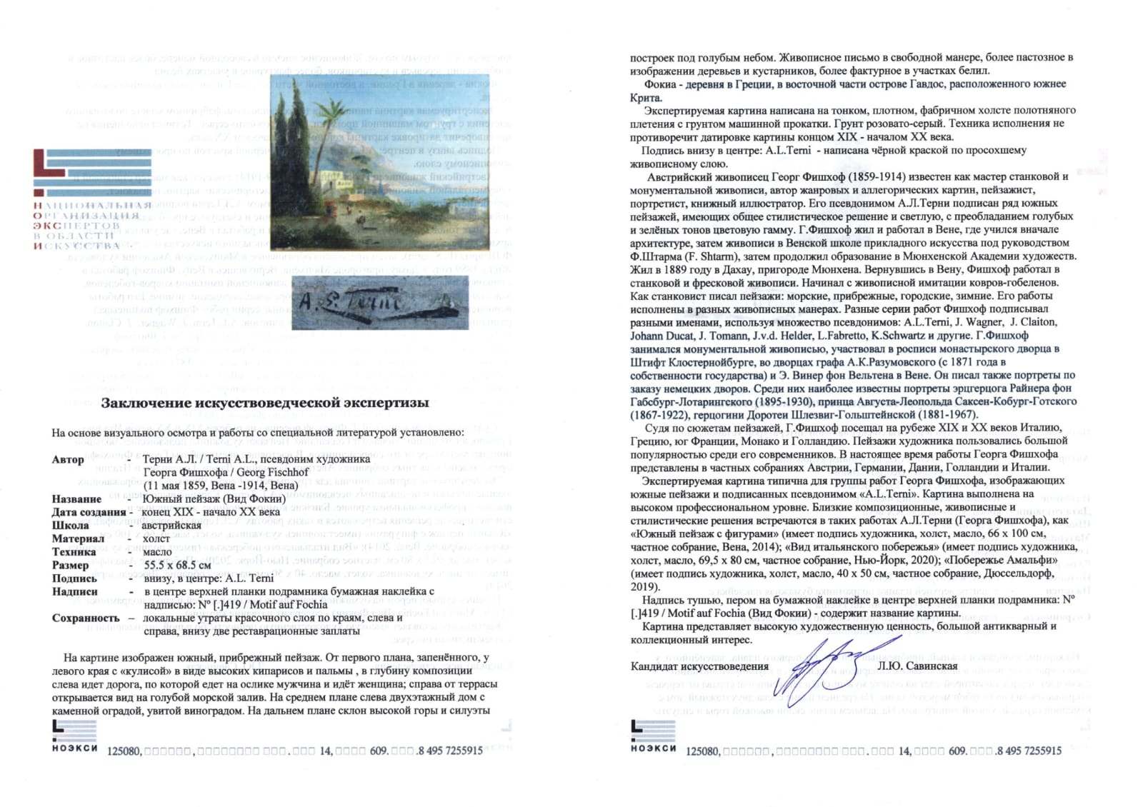 Подпись принадлежит австрийскому живописцу Георгу Фишхофу (1859-1914). Псевдонимом А.Л. Терни им подписан ряд южных пейзажей, имеющих общее стилистическое решение и светлую, с преобладанием голубых и зелёных тонов цветовую гамму, Г. Фишхоф жил и работал в Вене, где учился в художественной школе под руководством Ф. Штанна (F. Shtarm), затем продолжил образование в Мюнхенской академии художеств. Фишхоф работал в станковой и фресковой живописи, создавал картоны для ковров. Как станковист он писал пейзажи: морские, прибрежные, городские, зимние, его работы исполнены в разных живописных манерах. Разные серии работ Фишхоф подписывал разными именами; на сегодняшний день известно семь его псевдонимов, в том числе «J. Wagner», «J. Claiton», «Johann Ducat», «J. Tomann». Судя по сюжетам пейзажей, он посещал на рубеже XIX и XX веков Италию (Неаполь), Грецию и юг Франции (Ниццу). Пейзажи Георга Фишхофа пользовались большой популярностью среди его современников и в настоящее время представлены в частных собраниях Австрии, Германии, Голландии, Италии и России.