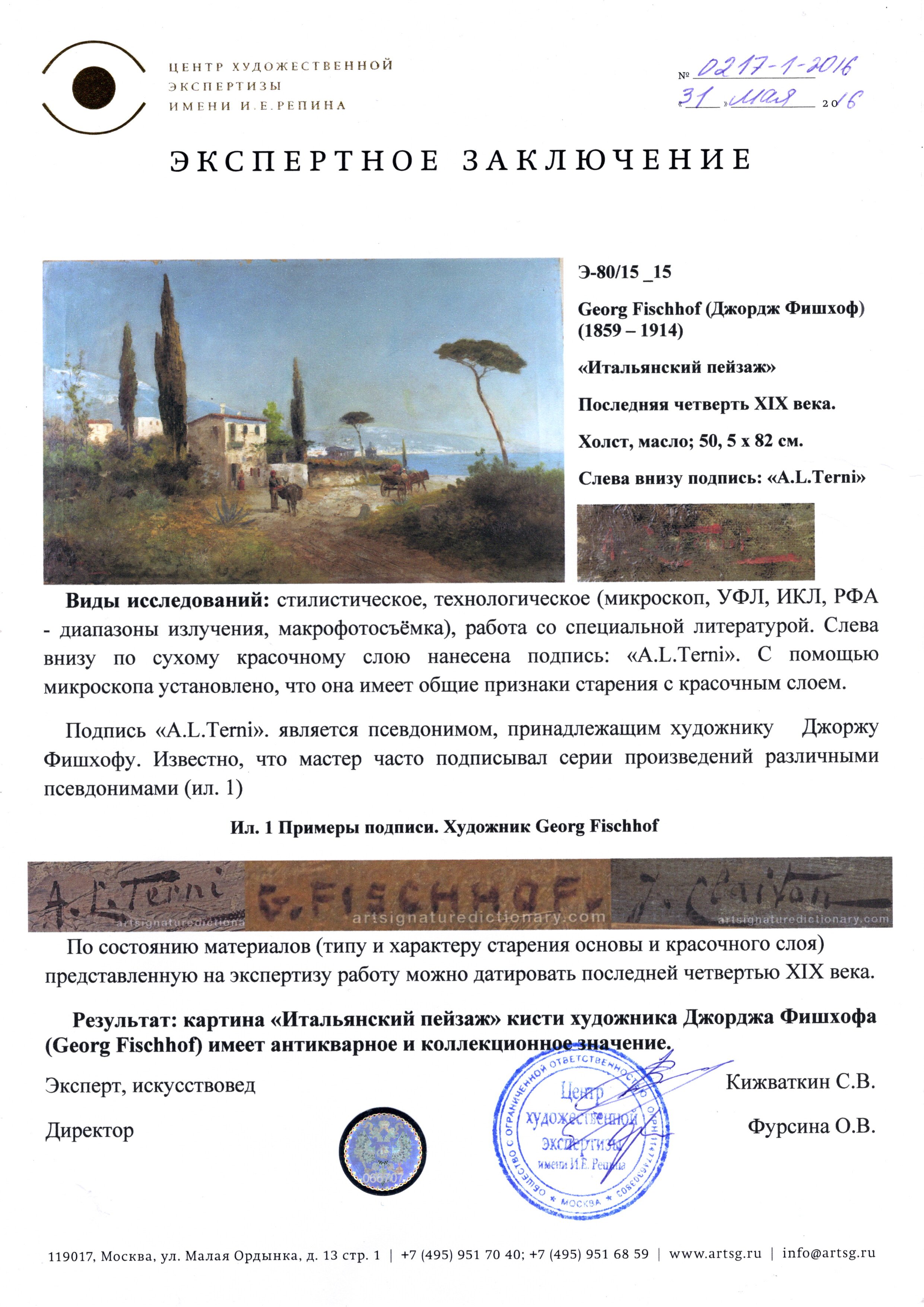Подпись принадлежит австрийскому живописцу Джорджу Фишхофу (1859-1914). Псевдонимом А.Л. Терни им подписан ряд южных пейзажей, имеющих общее стилистическое решение и светлую, с преобладанием голубых и зелёных тонов цветовую гамму, Д. Фишхоф жил и работал в Вене, где учился в художественной школе под руководством Ф. Штанна (F. Shtarm), затем продолжил образование в Мюнхенской академии художеств. Фишхоф работал в станковой и фресковой живописи, создавал картоны для ковров. Как станковист он писал пейзажи: морские, прибрежные, городские, зимние, его работы исполнены в разных живописных манерах. Разные серии работ Фишхоф подписывал разными именами; на сегодняшний день известно семь его псевдонимов, в том числе «J. Wagner», «J. Claiton», «Johann Ducat», «J. Tomann». Судя по сюжетам пейзажей, он посещал на рубеже XIX и XX веков Италию (Неаполь), Грецию и юг Франции (Ниццу). Пейзажи Георга Фишхофа пользовались большой популярностью среди его современников и в настоящее время представлены в частных собраниях Австрии, Германии, Голландии, Италии и России.